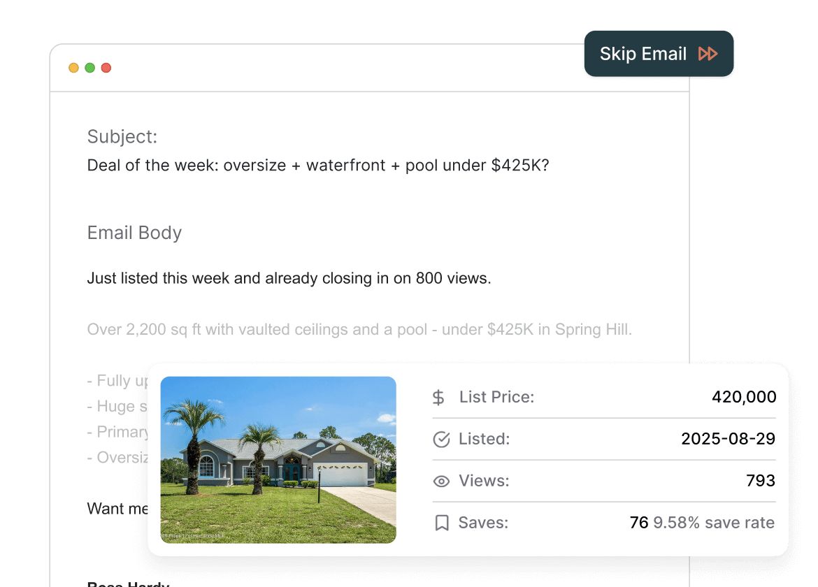 For every action plan you create, AI Mode will write the perfect email for you. For Deal of the Week, it will research your area, find the best home, extract the data of the listing, feed it into a prompt, and write a professional email that’s personalized to your market.