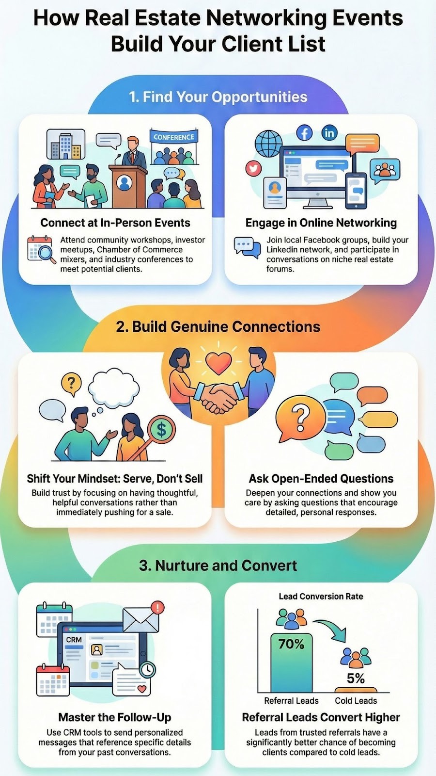 They help agents build familiarity and trust. Many clients choose agents they already know or were referred to. Networking creates warm connections instead of cold outreach, leading to more consistent business over time.