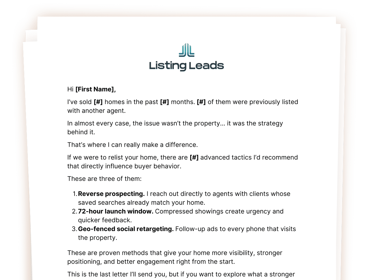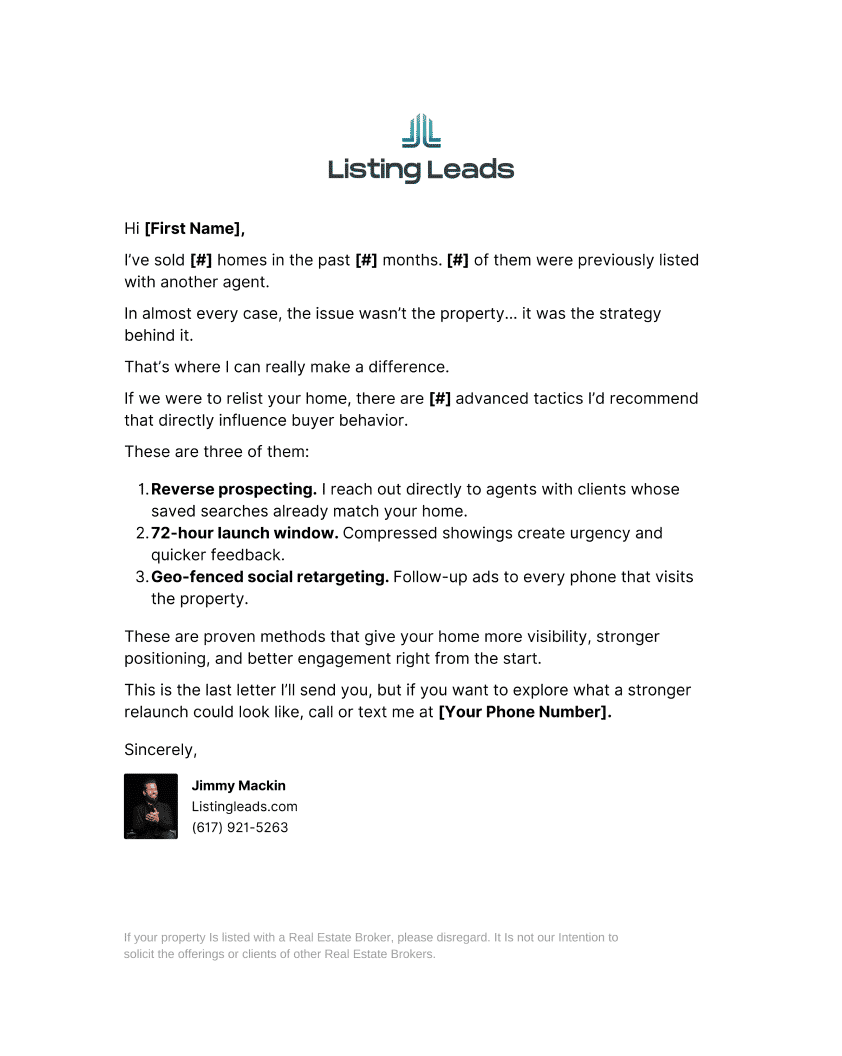 This final letter is where you fully step into authority. You’re not easing in anymore - you’re stating facts. Your track record. Your volume. And the clear pattern you’ve seen when homes don’t sell. The problem isn’t the house. It’s the plan behind it.
