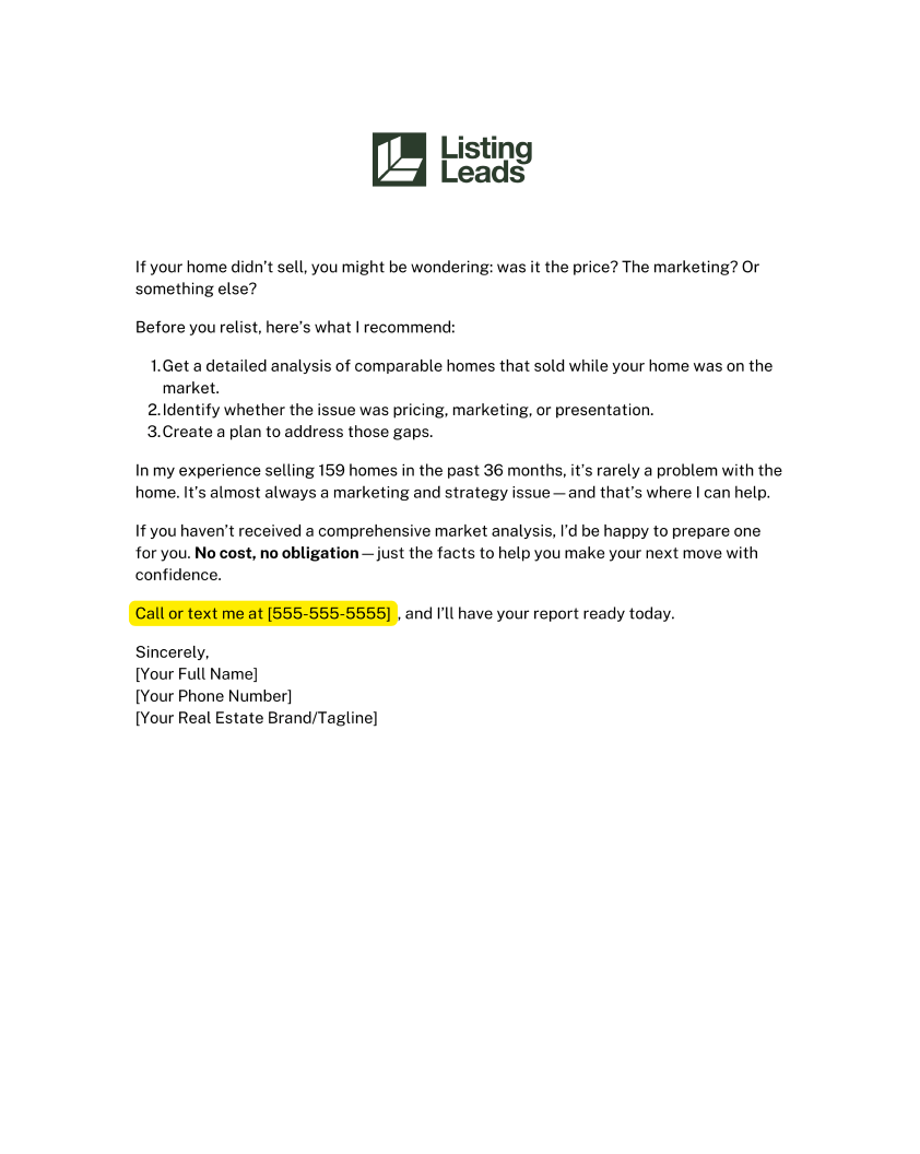 Letter 5 in the sequence is 'Before You Relist, Do This First.' At this stage, the homeowner is beginning to see the value in a strategic relisting. This letter offers a detailed market analysis as a key step before making their next move. It’s designed to position you as a resourceful and knowledgeable partner, providing the clarity they need to make an informed decision.