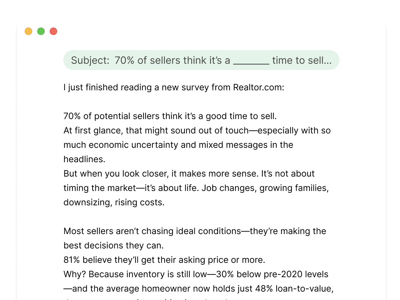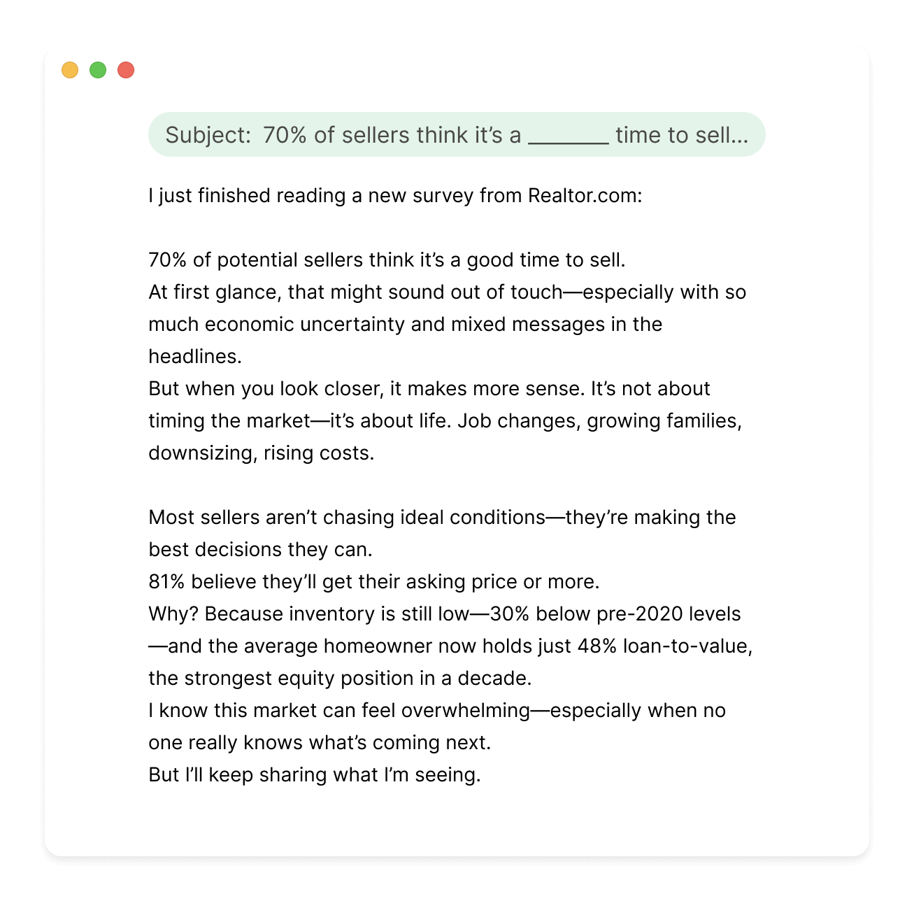 You need a platform that lets you send mass emails to your database. Use what you have—FUB, Follow Up Boss, Mailchimp, KVCore, Constant Contact, etc. If you’re not set up yet, get that handled first. You can’t send if you can’t hit send.