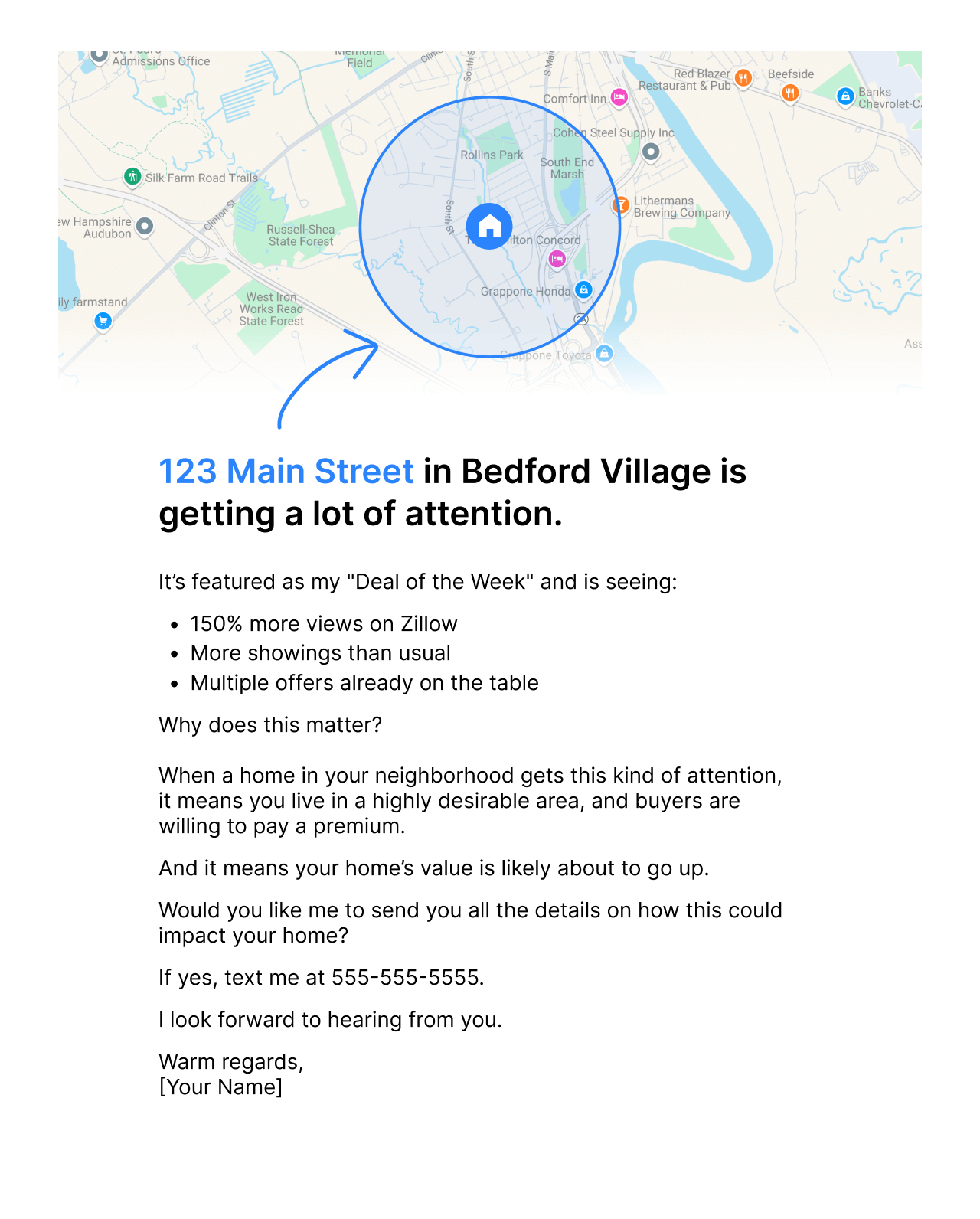 By letting the surrounding homeowners know about the buzz and activity around a nearby property, we create a ripple effect of awareness and interest. This not only highlights the desirability of the neighborhood but also positions you as the go-to expert who understands how to leverage market activity to benefit homeowners.