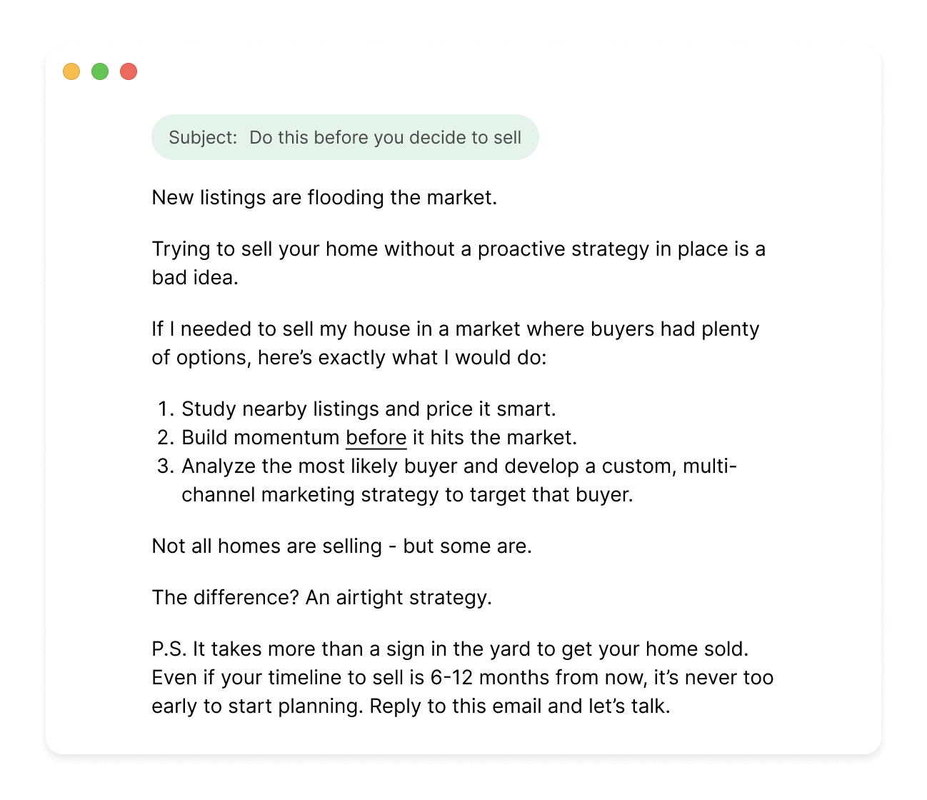 The subject line does the qualifying for you. If they open it, chances are they’re already thinking of selling. That’s a lead. Add them to your call list.