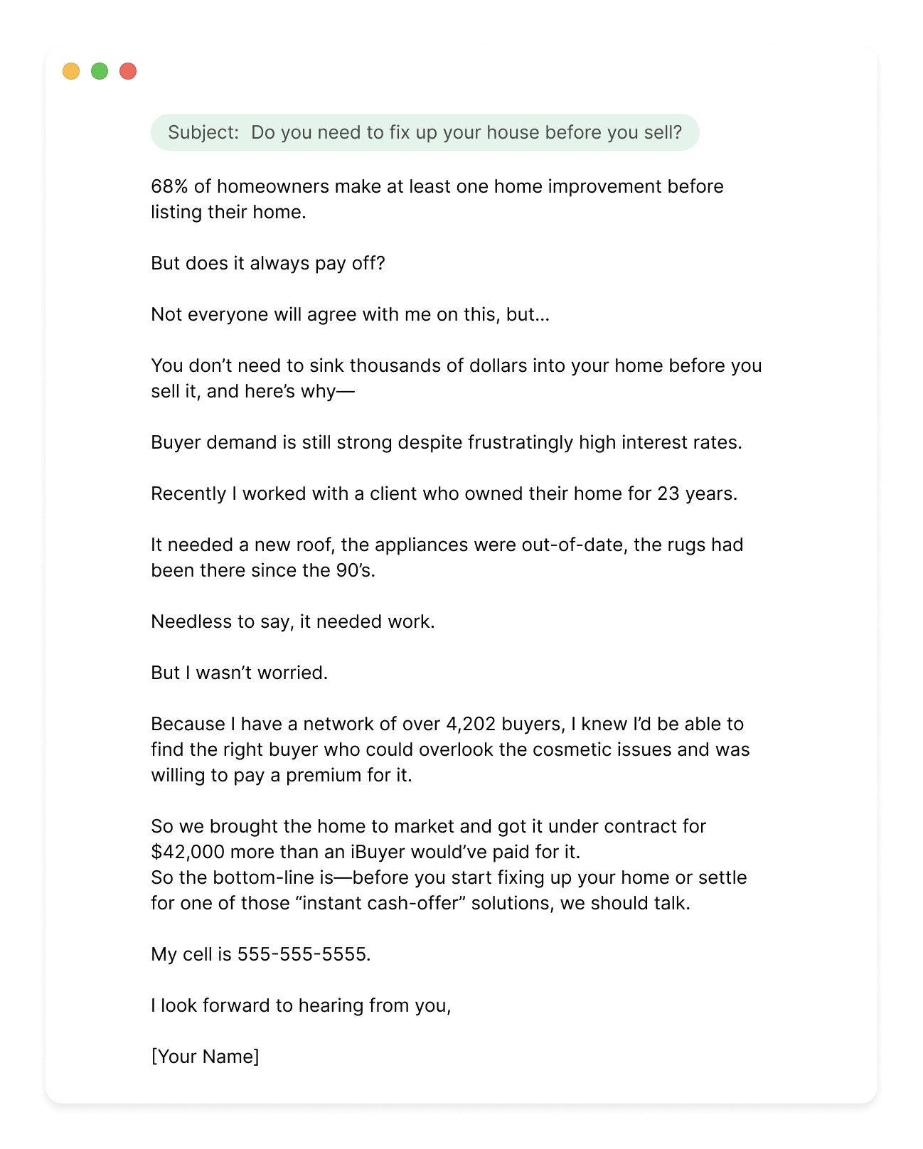 This email is so effective because it challenges that assumption with real results. If you recently worked with a client who had an outdated home, needed big-ticket repairs, and believed a traditional sale wasn’t worth the hassle, this is your chance to shift their perspective. Instead of pouring money into renovations or taking a lowball offer from an iBuyer, they leaned on your network of buyers. The result? A sale that netted them significantly more than an instant offer.
