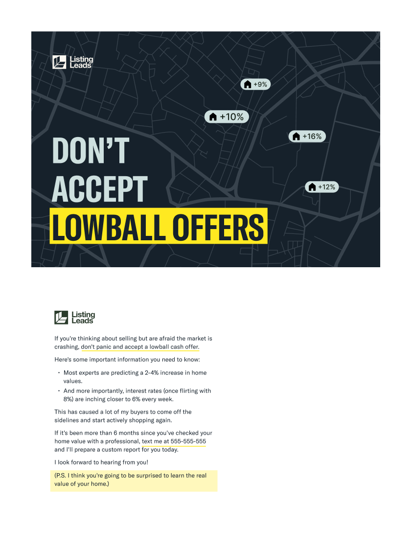 This postcard instills a sense of confidence in the consumer that you’re their advocate.Â