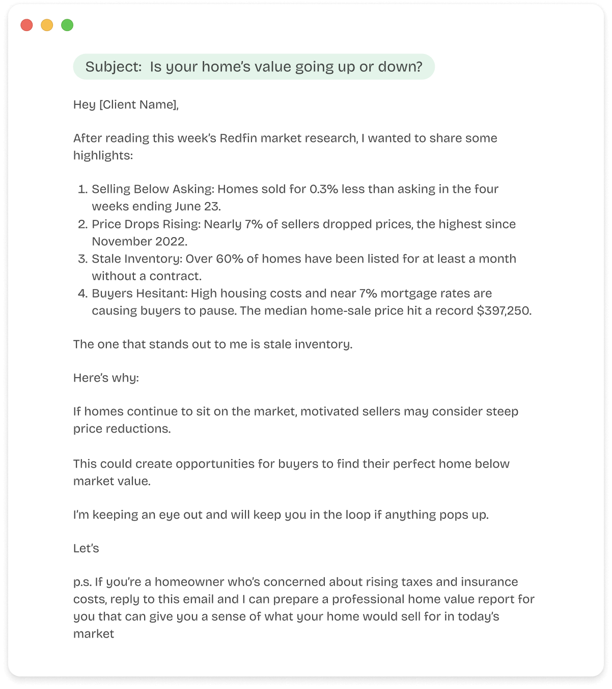 You need a platform that lets you send mass emails to your database. Use what you have—FUB, Follow Up Boss, Mailchimp, KVCore, Constant Contact, etc. If you’re not set up yet, get that handled first. You can’t send if you can’t hit send.