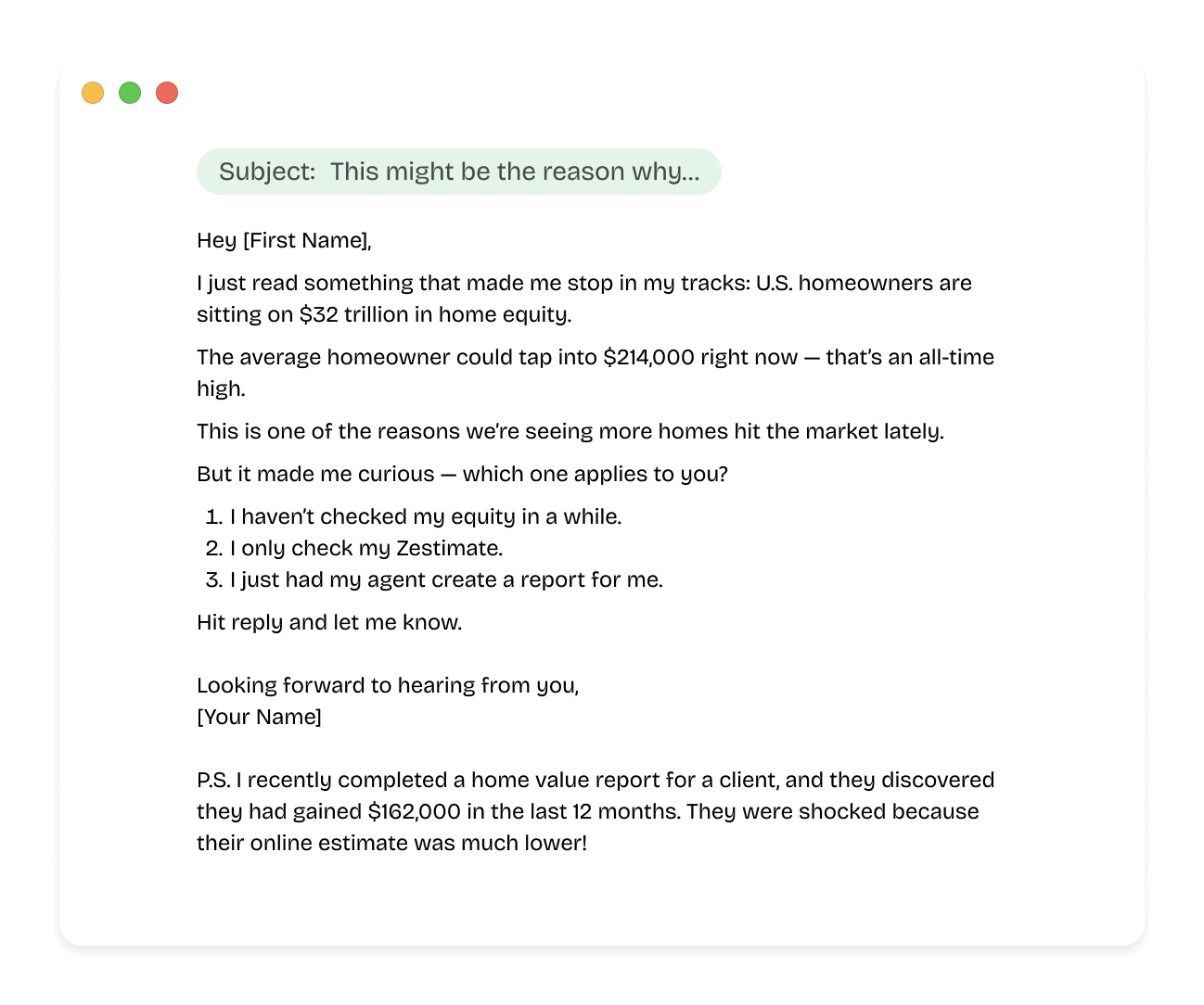 You need a platform that lets you send mass emails to your database. Use what you have—FUB, Follow Up Boss, Mailchimp, KVCore, Constant Contact, etc. If you’re not set up yet, get that handled first. You can’t send if you can’t hit send.
