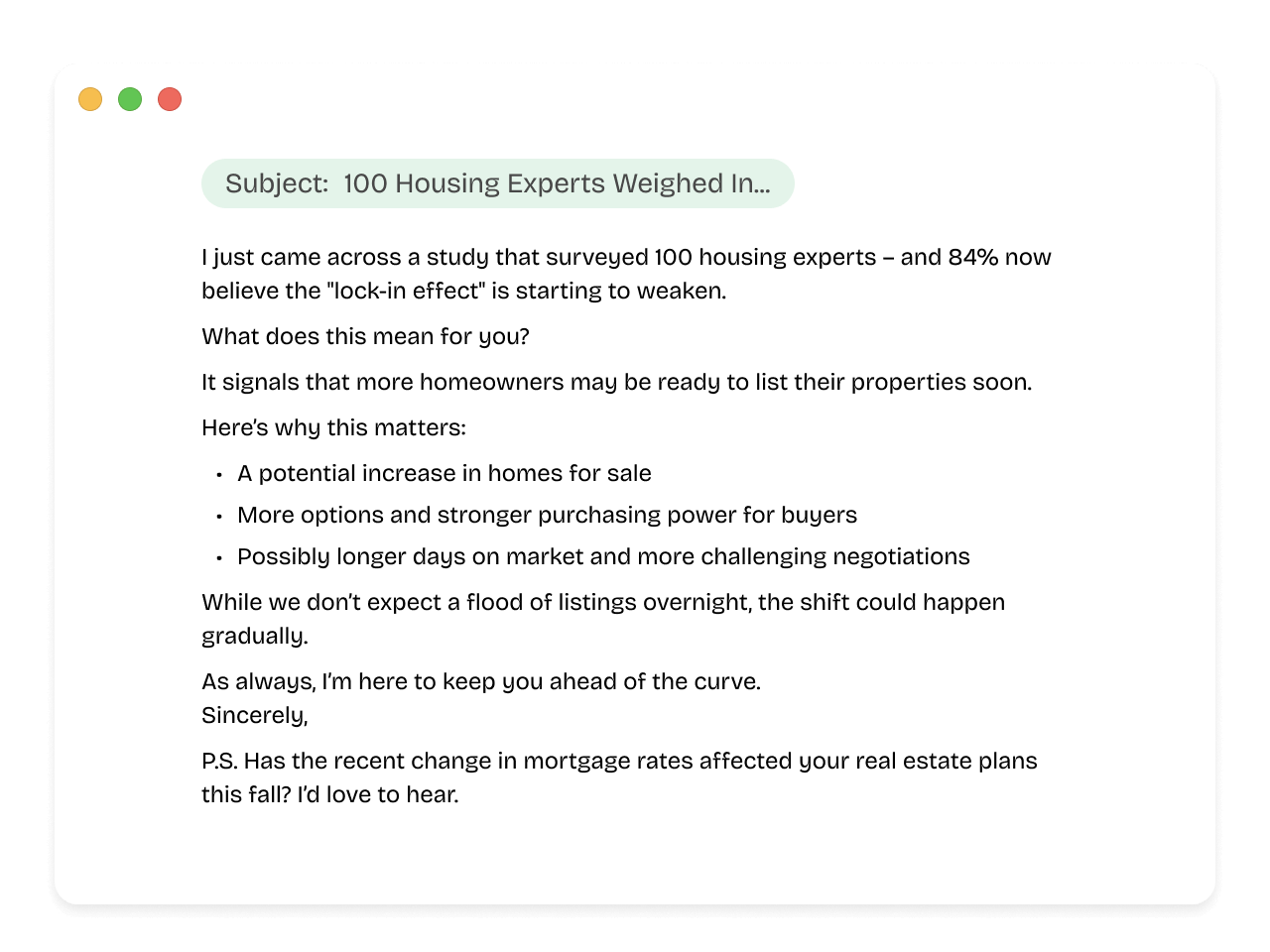 This email campaign is designed to keep your database informed about what is the second-order effect of interest rates dropping and how it might lead to more inventory hitting the market in the coming months.