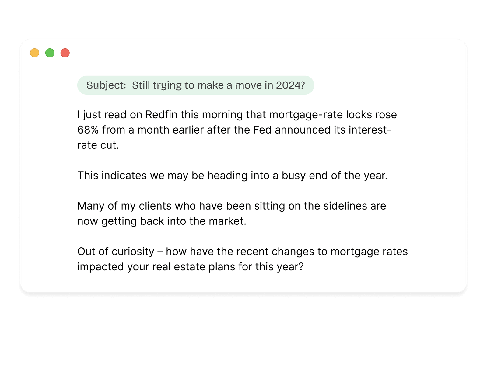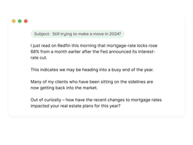 You need a platform that lets you send mass emails to your database. Use what you have—FUB, Follow Up Boss, Mailchimp, KVCore, Constant Contact, etc. If you’re not set up yet, get that handled first. You can’t send if you can’t hit send.
