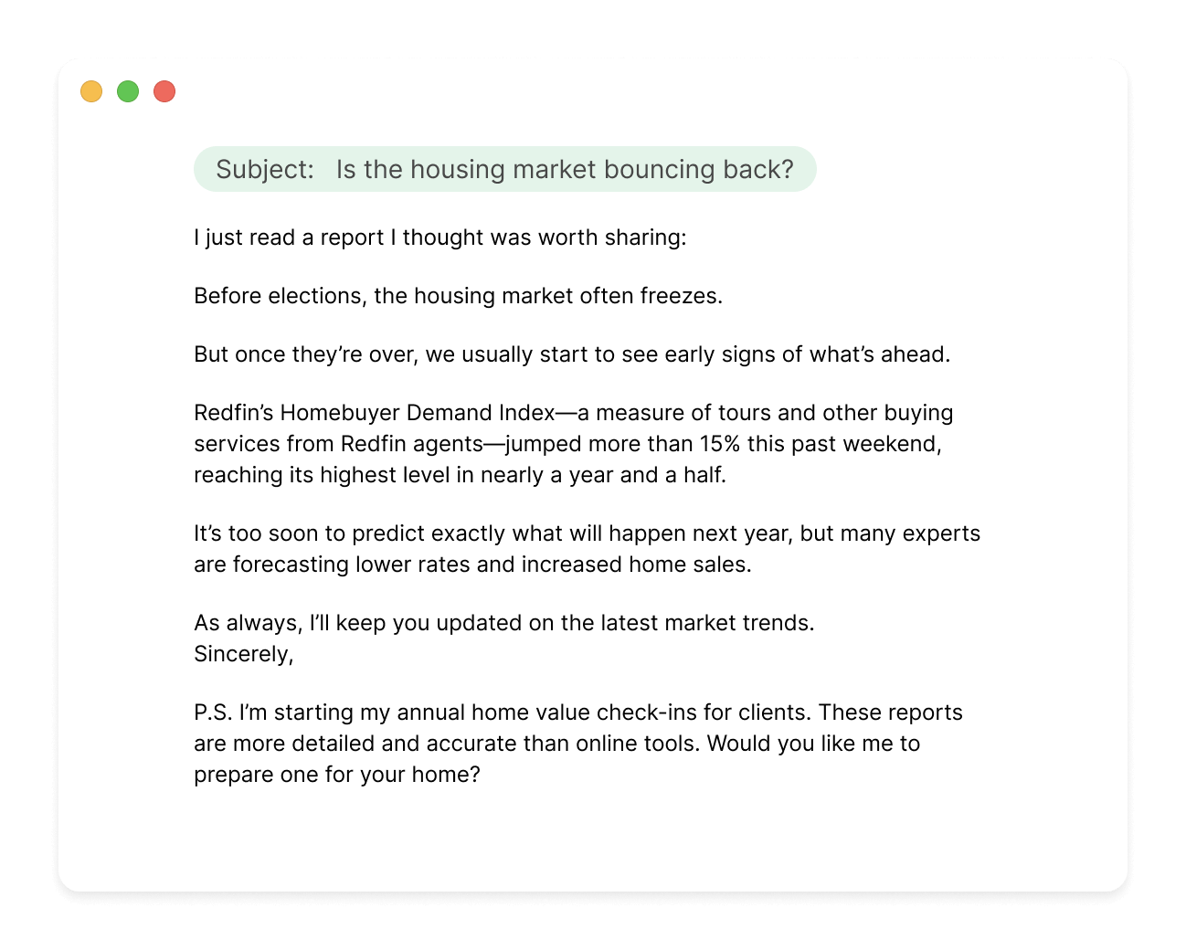 Consistently reaching out to your database with relevant, valuable insights isn’t just about staying in touch—it’s about positioning yourself as the trusted expert they’ll turn to when it’s time to buy or sell.