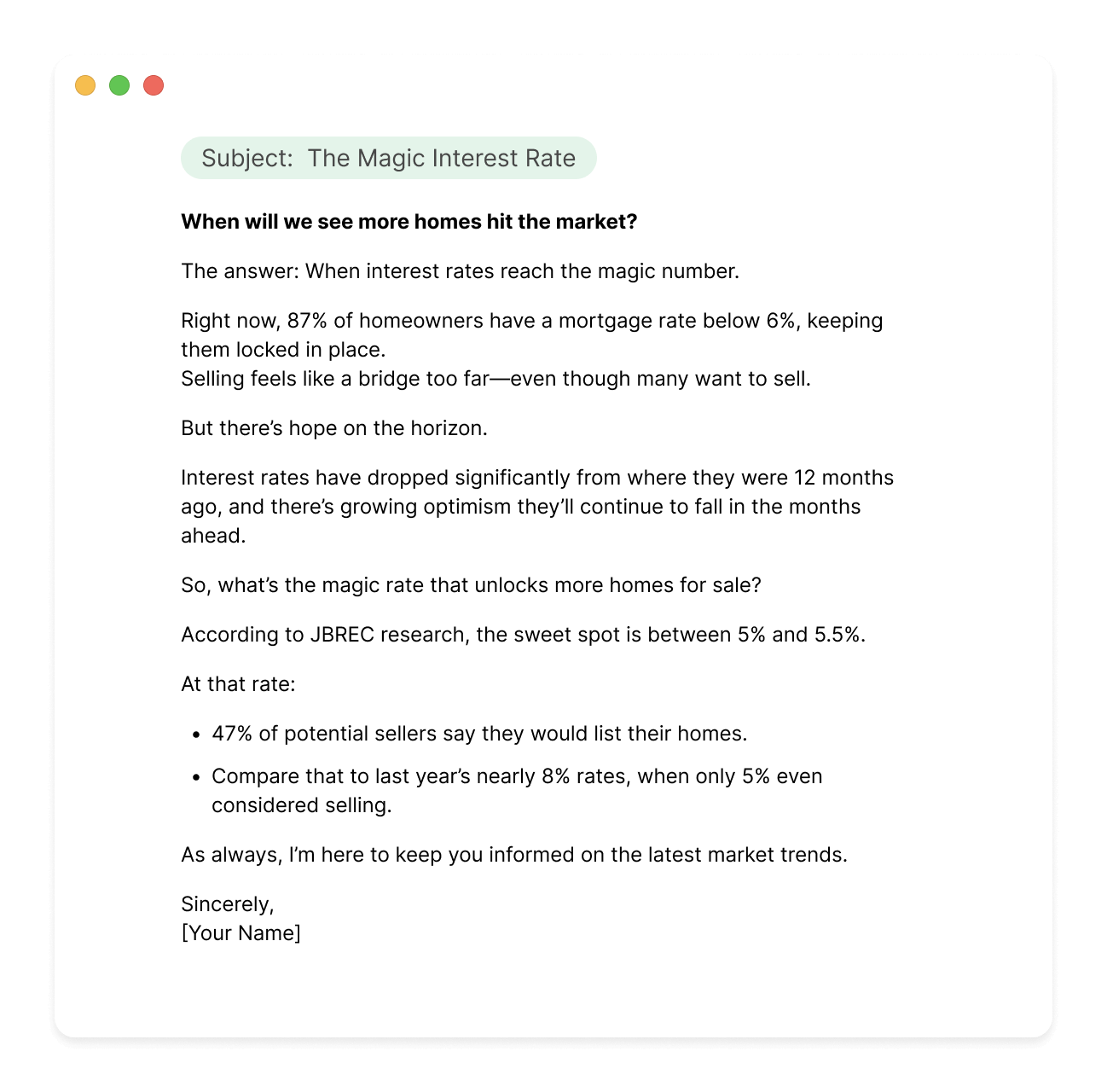 Emails that offer more than just a sales pitch, like sharing timely market insights or explaining mortgage trends, engage your audience. They show that you're not just here to sell, but to help them make smarter decisions. That kind of value fosters two-way conversations, which often lead to replies, questions, or feedback—turning passive recipients into warm leads.