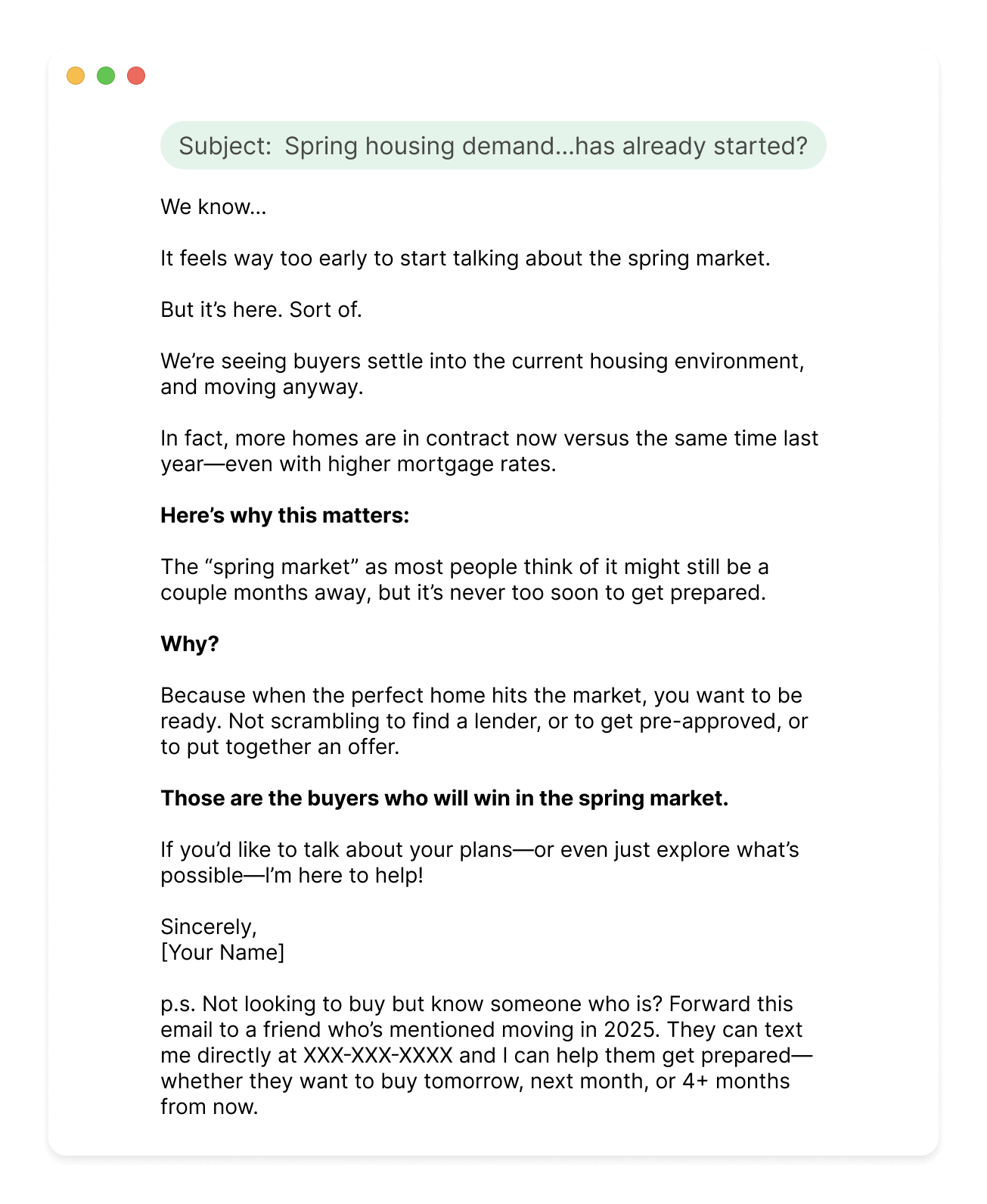 You need a platform that lets you send mass emails to your database. Use what you have—FUB, Follow Up Boss, Mailchimp, KVCore, Constant Contact, etc. If you’re not set up yet, get that handled first. You can’t send if you can’t hit send.