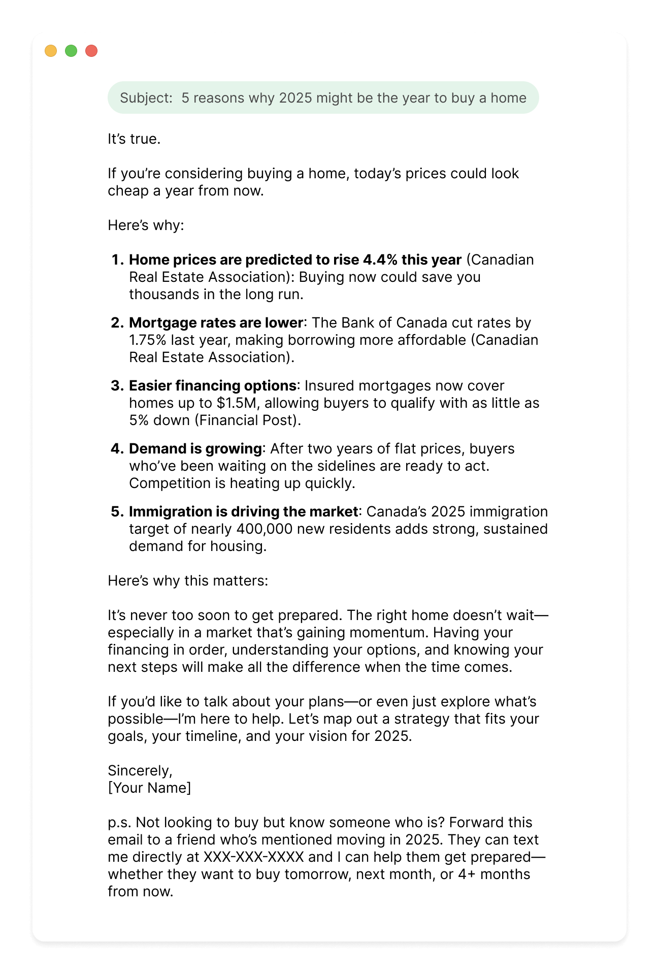 This email pulls data from The Canadian Real Estate Association (CREA) to explain why 2025 could be the year to make a move—and that’s where you come in.