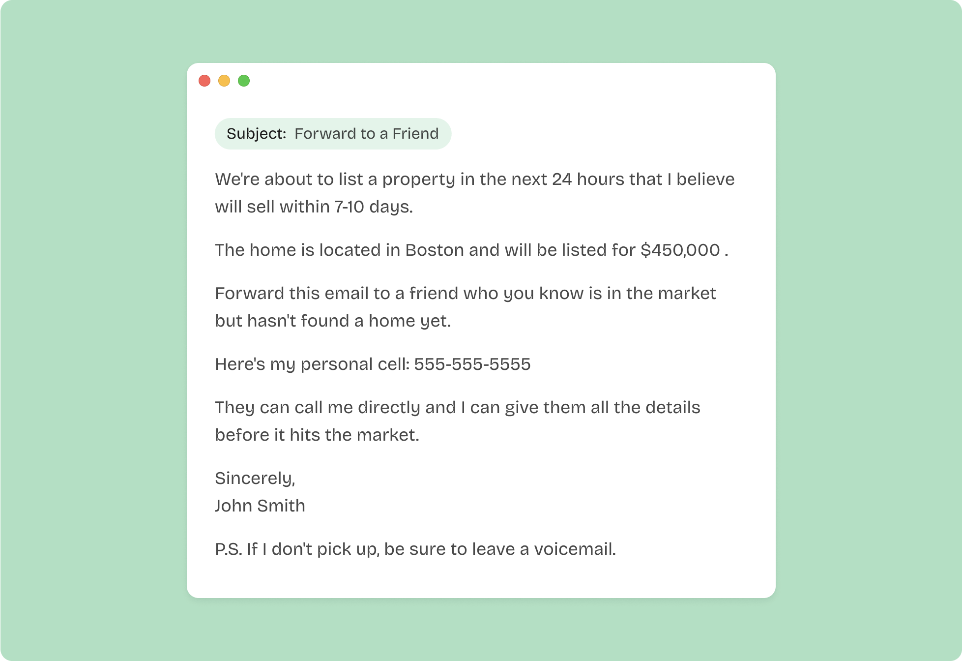 You need a platform that lets you send mass emails to your database. Use what you have—FUB, Follow Up Boss, Mailchimp, KVCore, Constant Contact, etc. If you’re not set up yet, get that handled first. You can’t send if you can’t hit send.