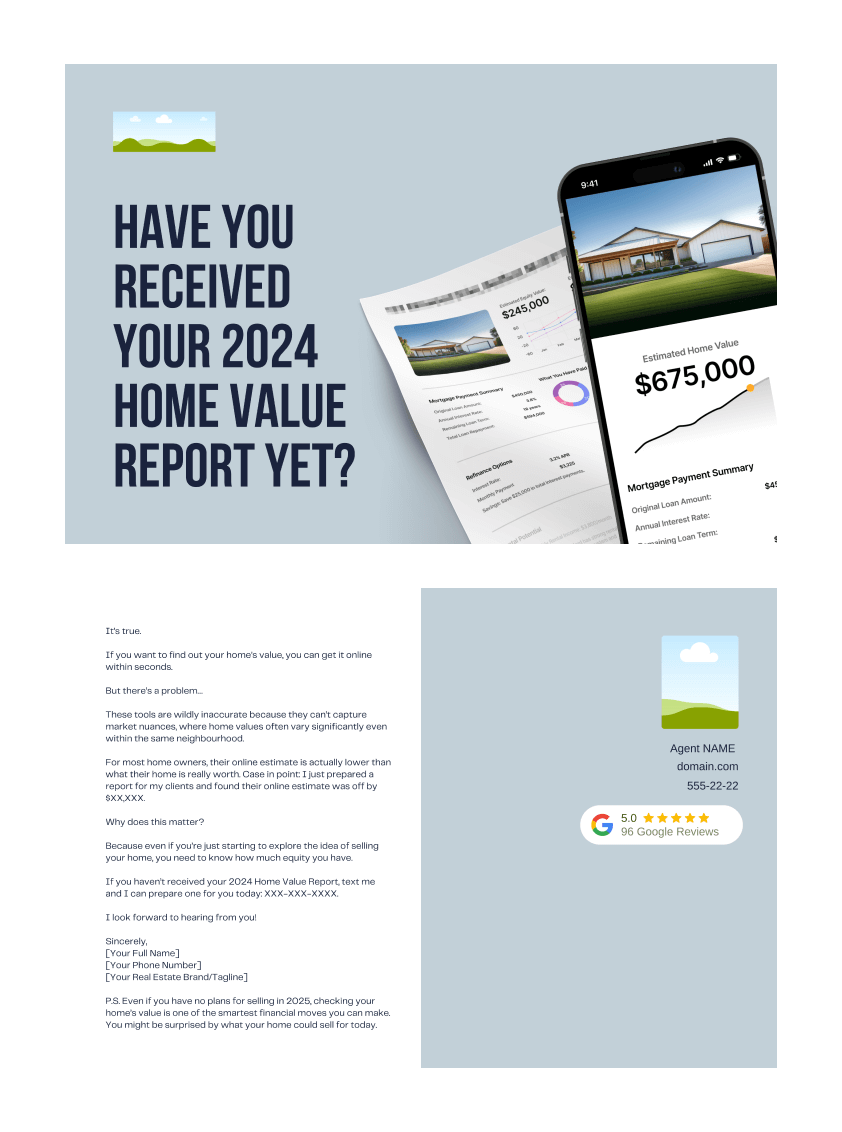 Nearly 30% of CMA request leads transact within 12 months, making home value reports one of the most effective tools for generating future business. This direct mail campaign captures attention with the hook, “Have you received your 2024 home value report yet?”—a question that implies homeowners should already have this information, encouraging them to reach out.