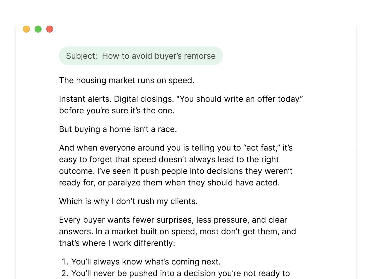 This campaign flips that script. It positions you as the agent who slows the process down just enough for buyers to feel informed, prepared, and confident. That’s how you stand apart—and how you turn first‑time conversations into long‑term clients.