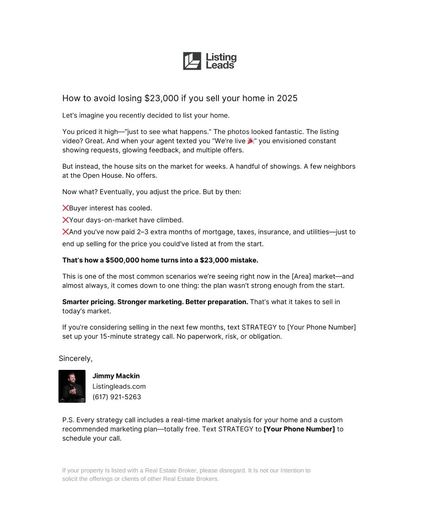 It takes sellers out of “let’s test the market” mode and shows them, clearly and calmly, how that mindset leads to a $23,000 mistake they never saw coming. Use this letter to reframe what smart pricing actually means in today’s market.