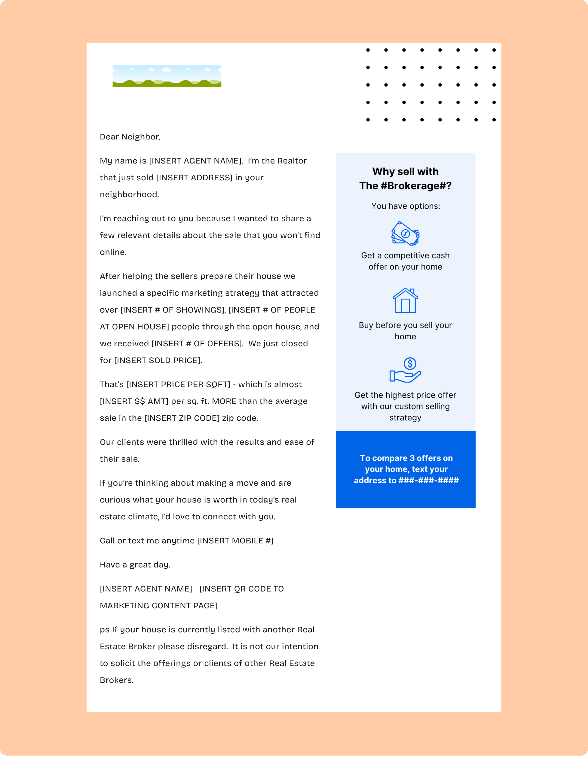 2. Create a campaign that provides information the consumer can't find online (i.e. # of offers, # of showings, etc.) with a simple and clear call-to-action. Don't include the final sale price—that gives potential sellers a reason to call.