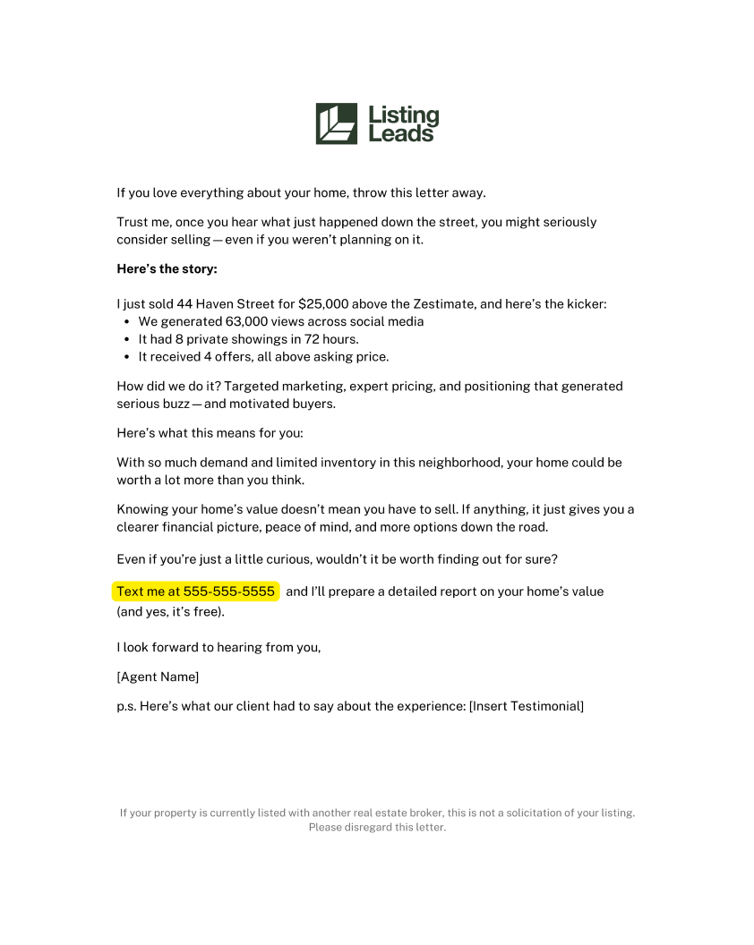 Including a real client success story—selling a home for $25,000 over Zestimate—adds credibility and proves your expertise, making your offer even more compelling.