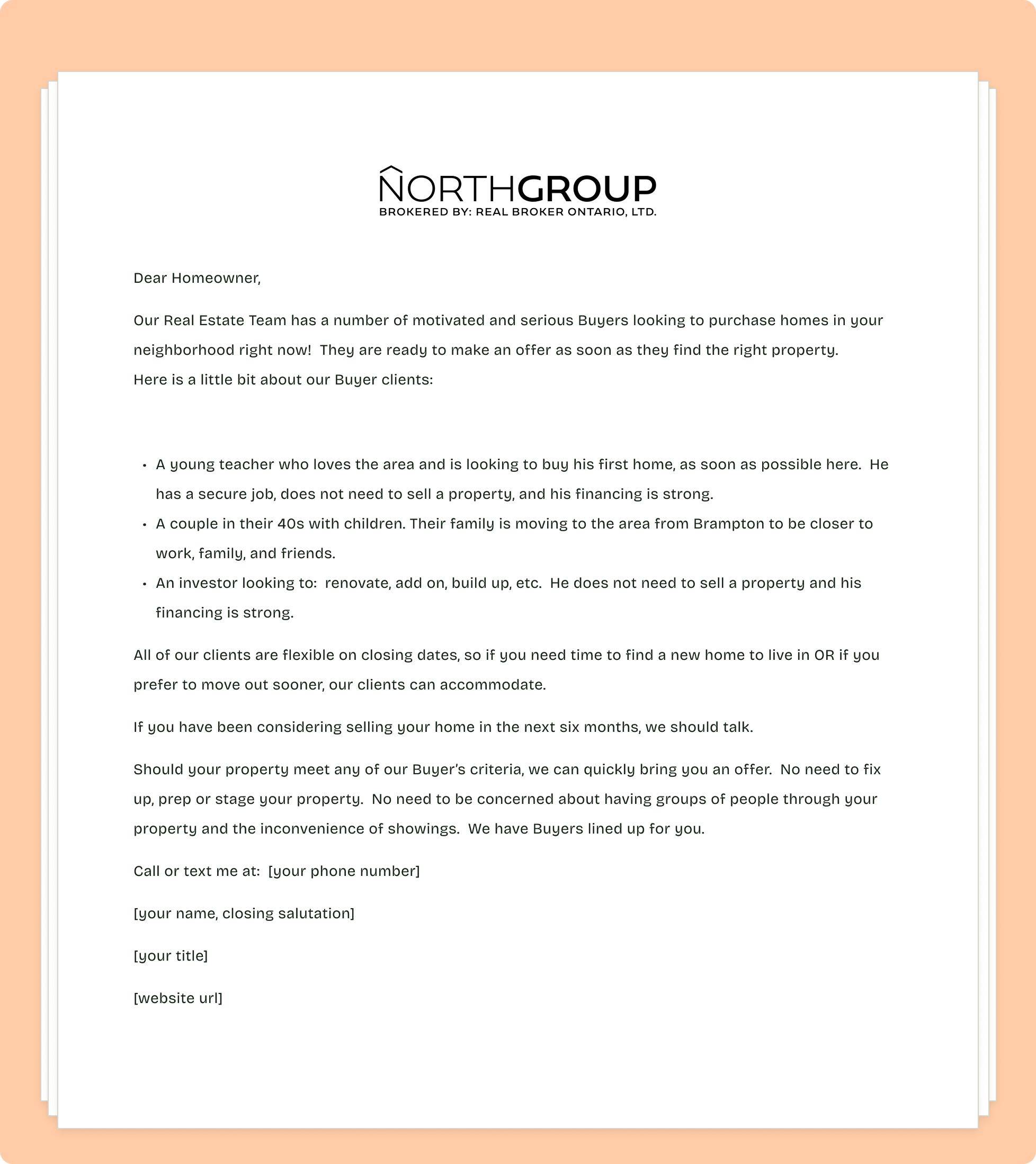 - Write a letter to homeowners who live in the neighborhoods where your buyers are looking to live.