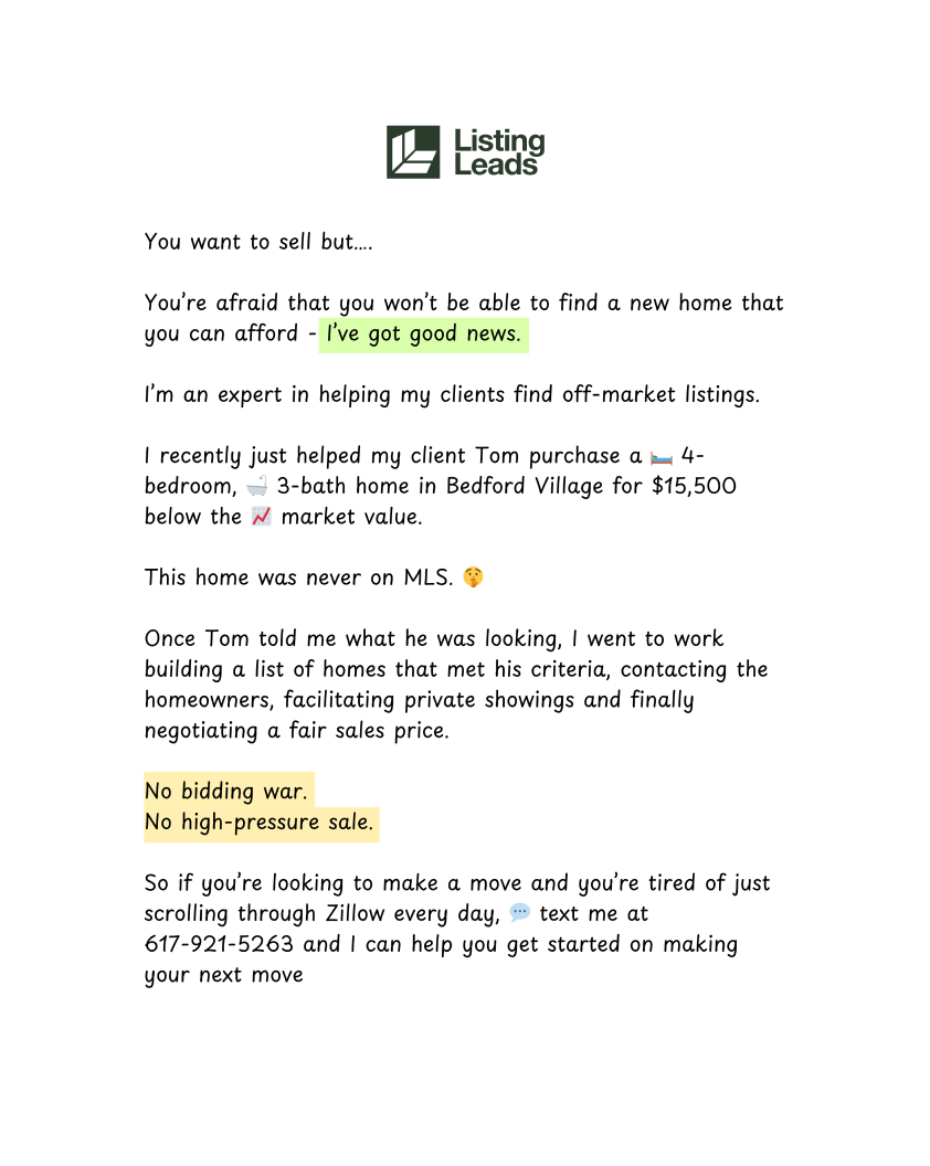 Simple Call to Action:Encourages sellers to text the agent, making it easy to start the conversation without any pressure.