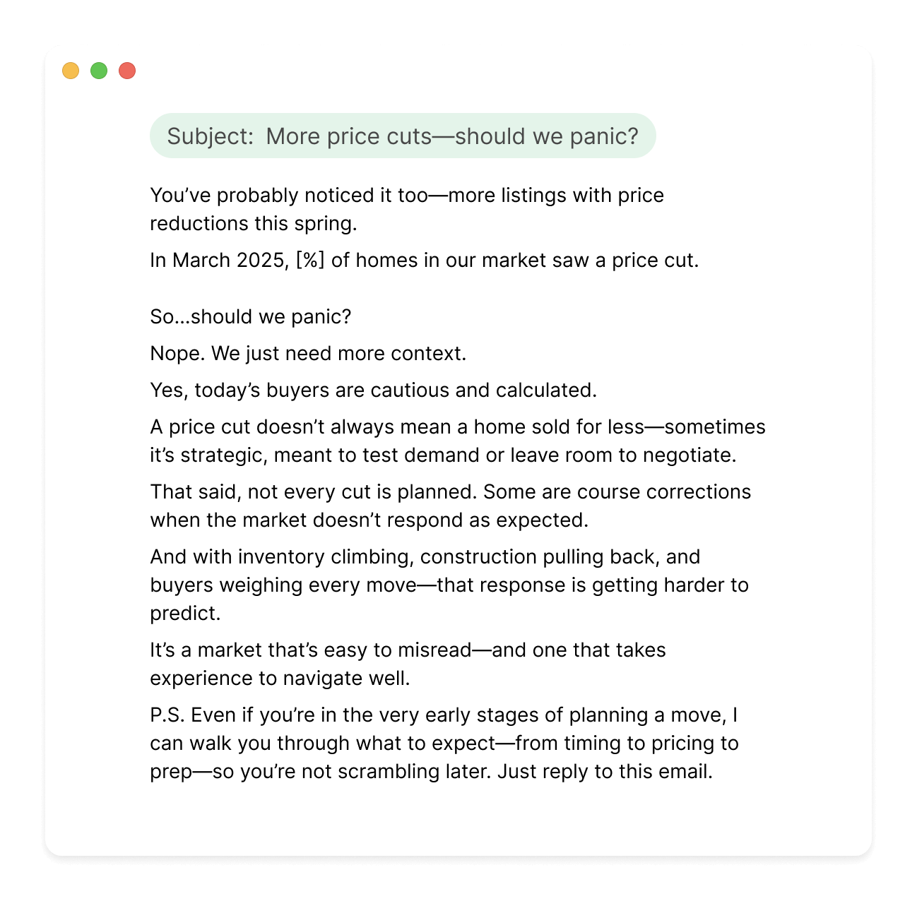 You need a platform that lets you send mass emails to your database. Use what you have—FUB, Follow Up Boss, Mailchimp, KVCore, Constant Contact, etc. If you’re not set up yet, get that handled first. You can’t send if you can’t hit send.