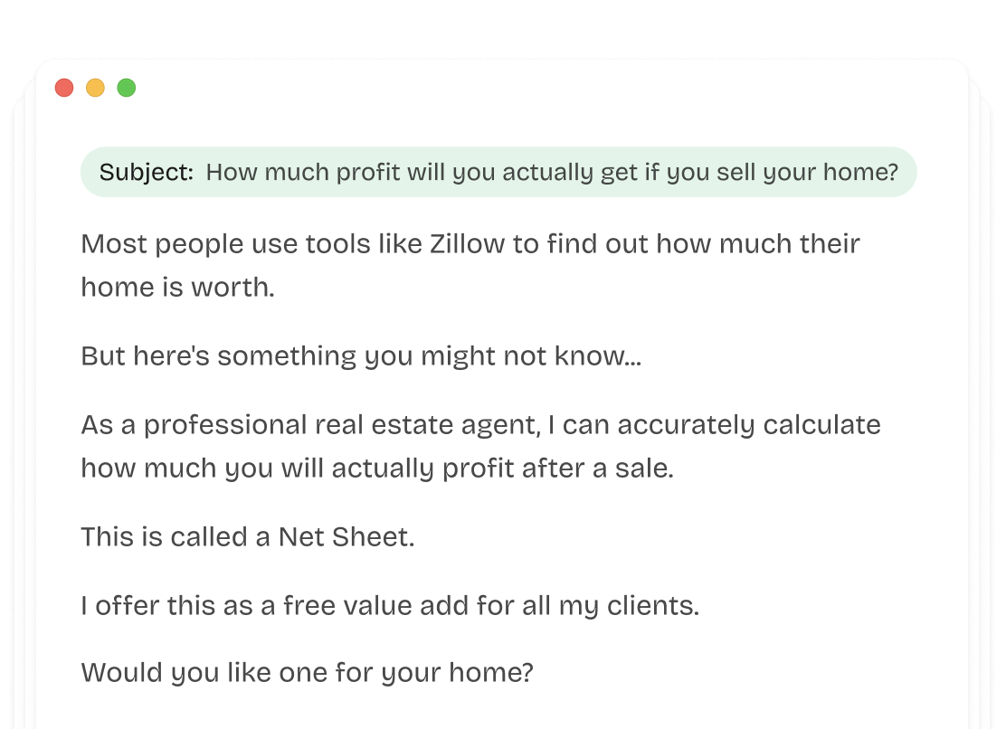 You need a platform that lets you send mass emails to your database. Use what you have—FUB, Follow Up Boss, Mailchimp, KVCore, Constant Contact, etc. If you’re not set up yet, get that handled first. You can’t send if you can’t hit send.