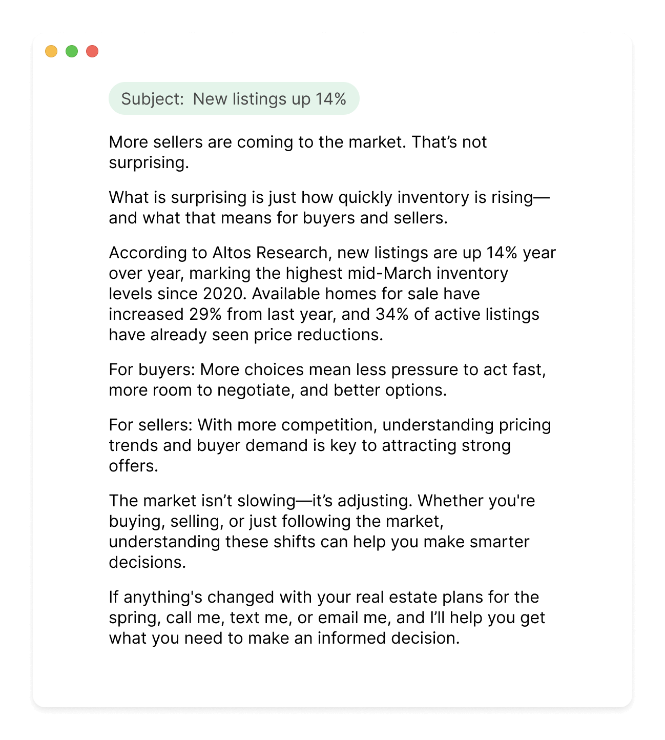 When you consistently share market insights, you position yourself as the go-to expert—someone clients trust long before they’re ready to buy or sell. That’s why we’ve crafted this value-first email for you. It delivers key market trends in a way that’s easy to digest and keeps you top-of-mind.