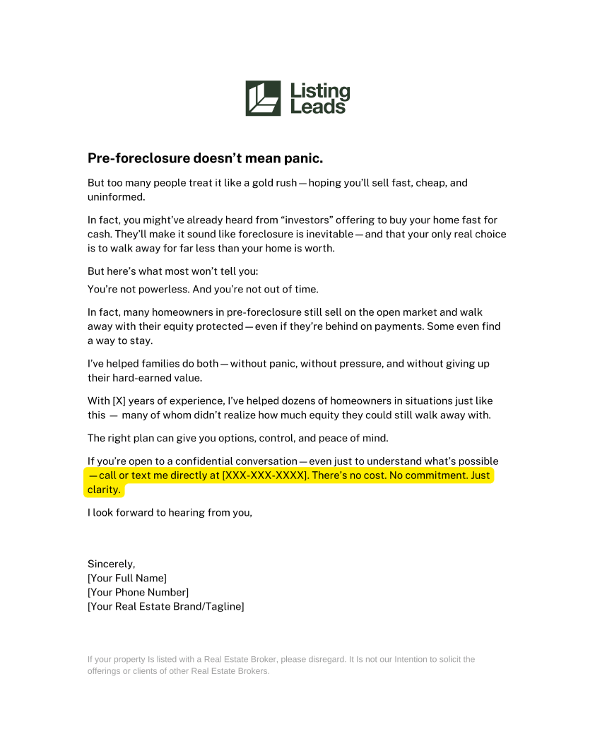 Right now, foreclosures are rising across the country. And while headlines spark panic, your role is to bring clarity. This letter is designed to do exactly that: