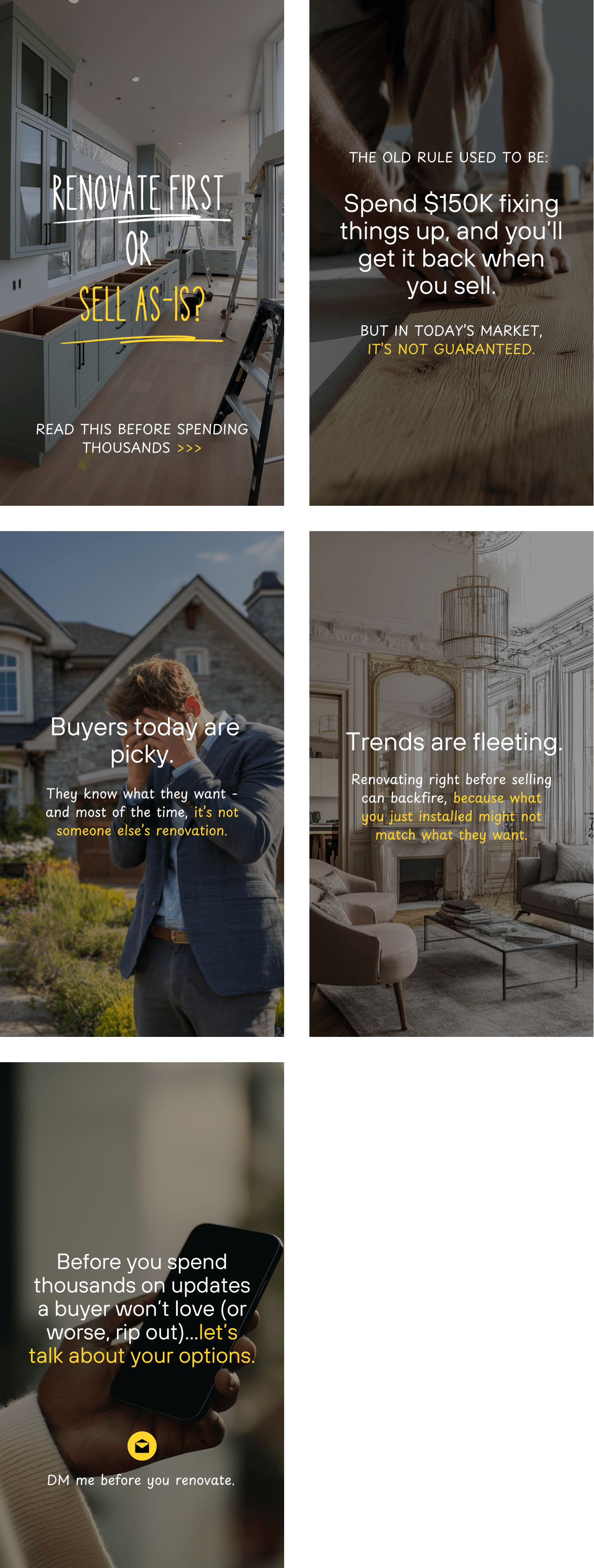 This Instagram carousel gives you a sharp, scroll-stopping way to challenge the assumption. You’re not saying don’t renovate. You’re showing them that not every project delivers a return, and some can even turn buyers off completely.