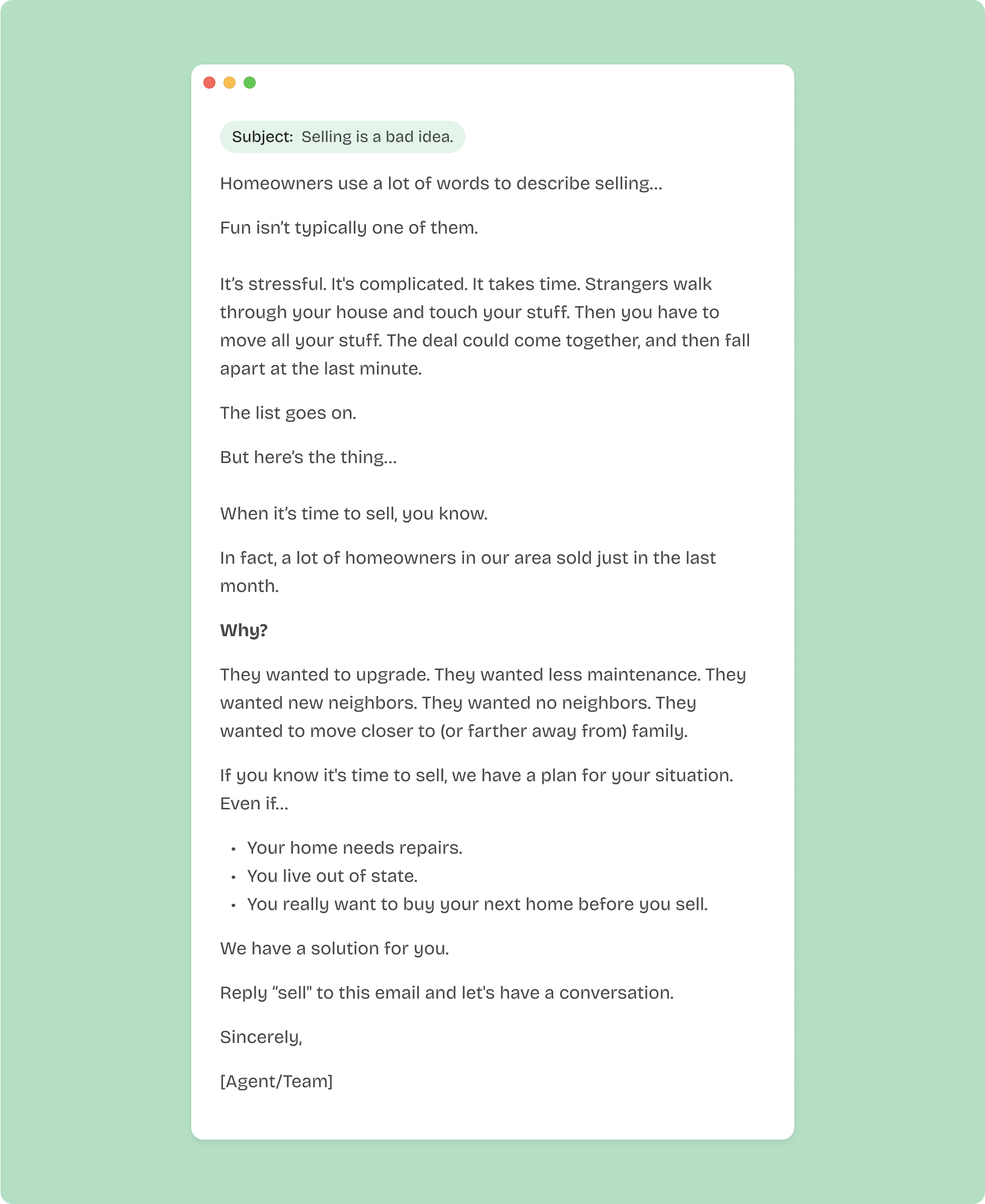 You need a platform that lets you send mass emails to your database. Use what you have—FUB, Follow Up Boss, Mailchimp, KVCore, Constant Contact, etc. If you’re not set up yet, get that handled first. You can’t send if you can’t hit send.