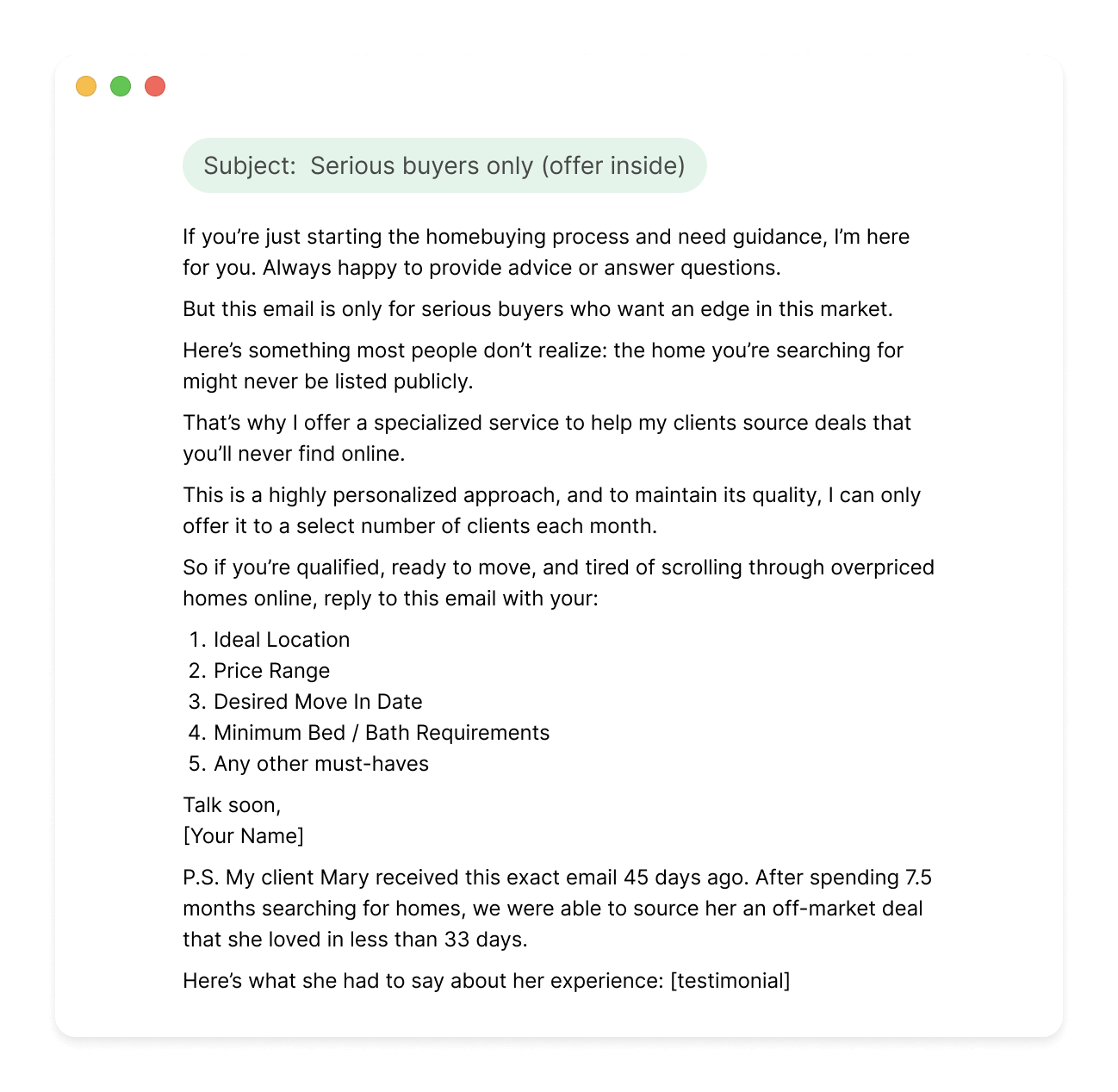 These emails are written to feel personal, not promotional—so keep them clean. Paste them as-is, with a short signature (your name, number, maybe your site). That’s it.