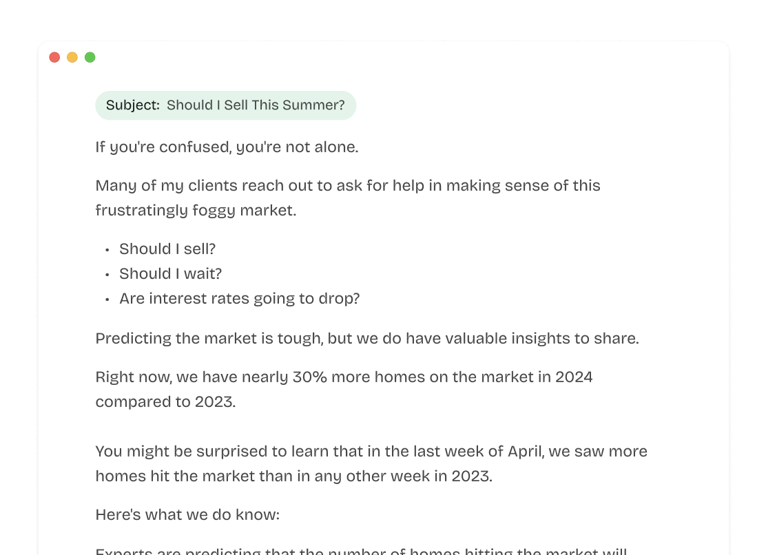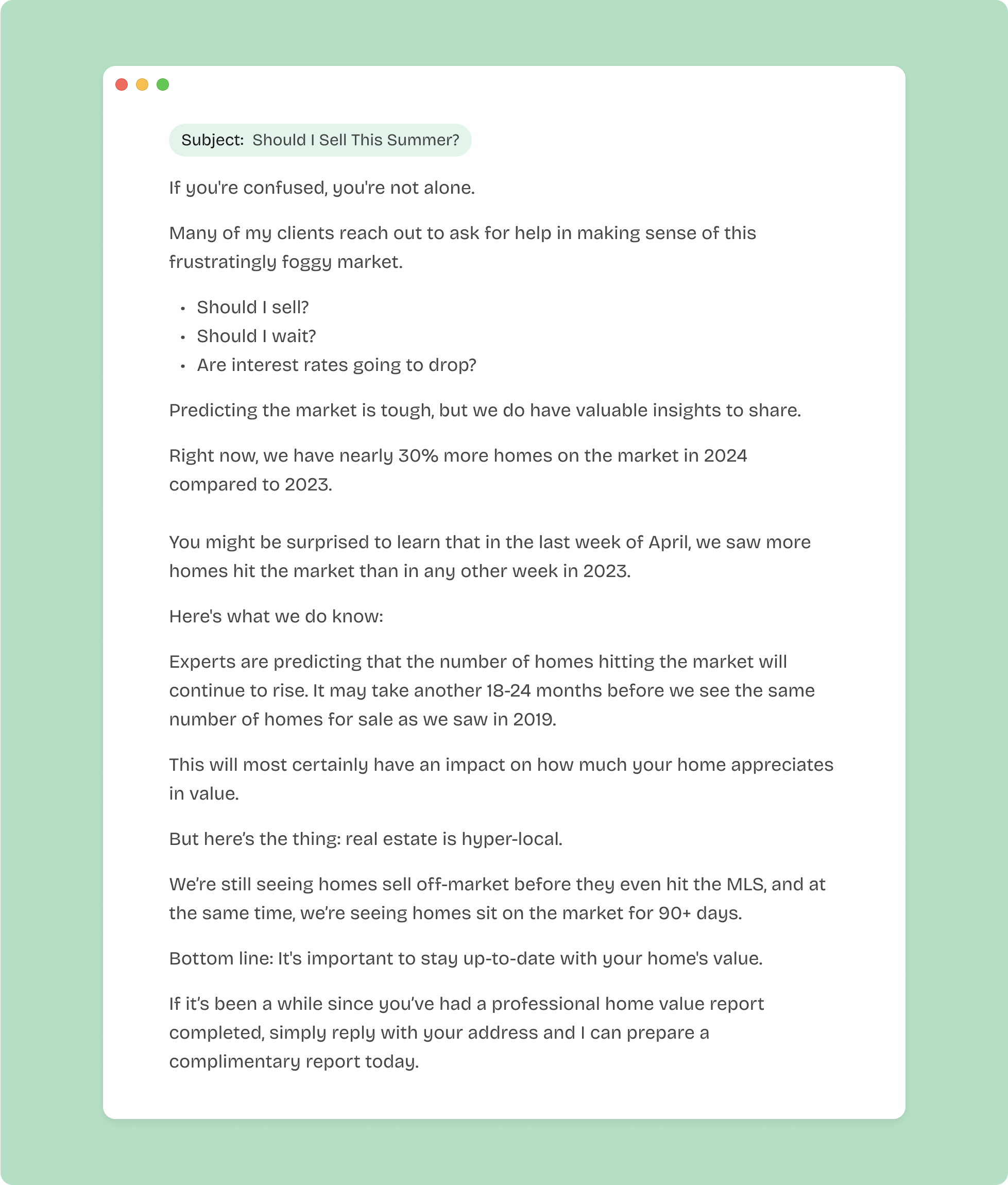 You need a platform that lets you send mass emails to your database. Use what you have—FUB, Follow Up Boss, Mailchimp, KVCore, Constant Contact, etc. If you’re not set up yet, get that handled first. You can’t send if you can’t hit send.