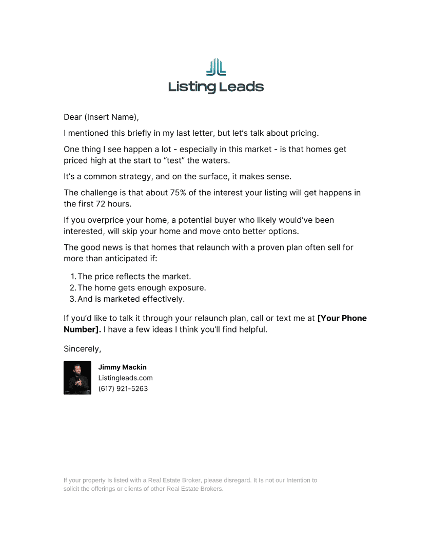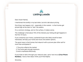 This letter tackles one of the most sensitive topics in real estate, but it does so without accusation or pressure. You’re not telling the seller they were wrong. You’re showing them how the market actually behaves when a listing launches, and why those first few days matter more than most people realize.