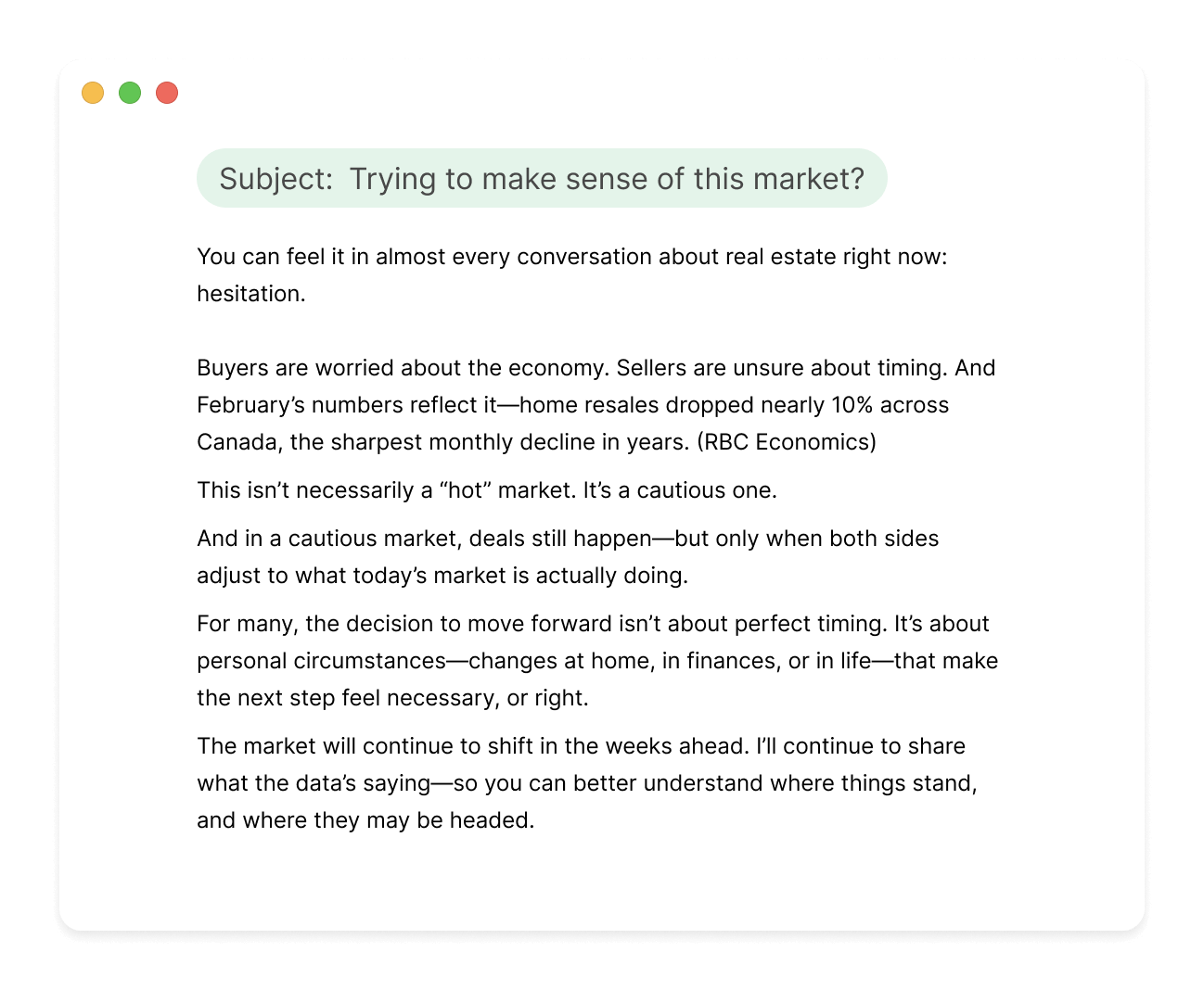 You need a platform that lets you send mass emails to your database. Use what you have—FUB, Follow Up Boss, Mailchimp, KVCore, Constant Contact, etc. If you’re not set up yet, get that handled first. You can’t send if you can’t hit send.