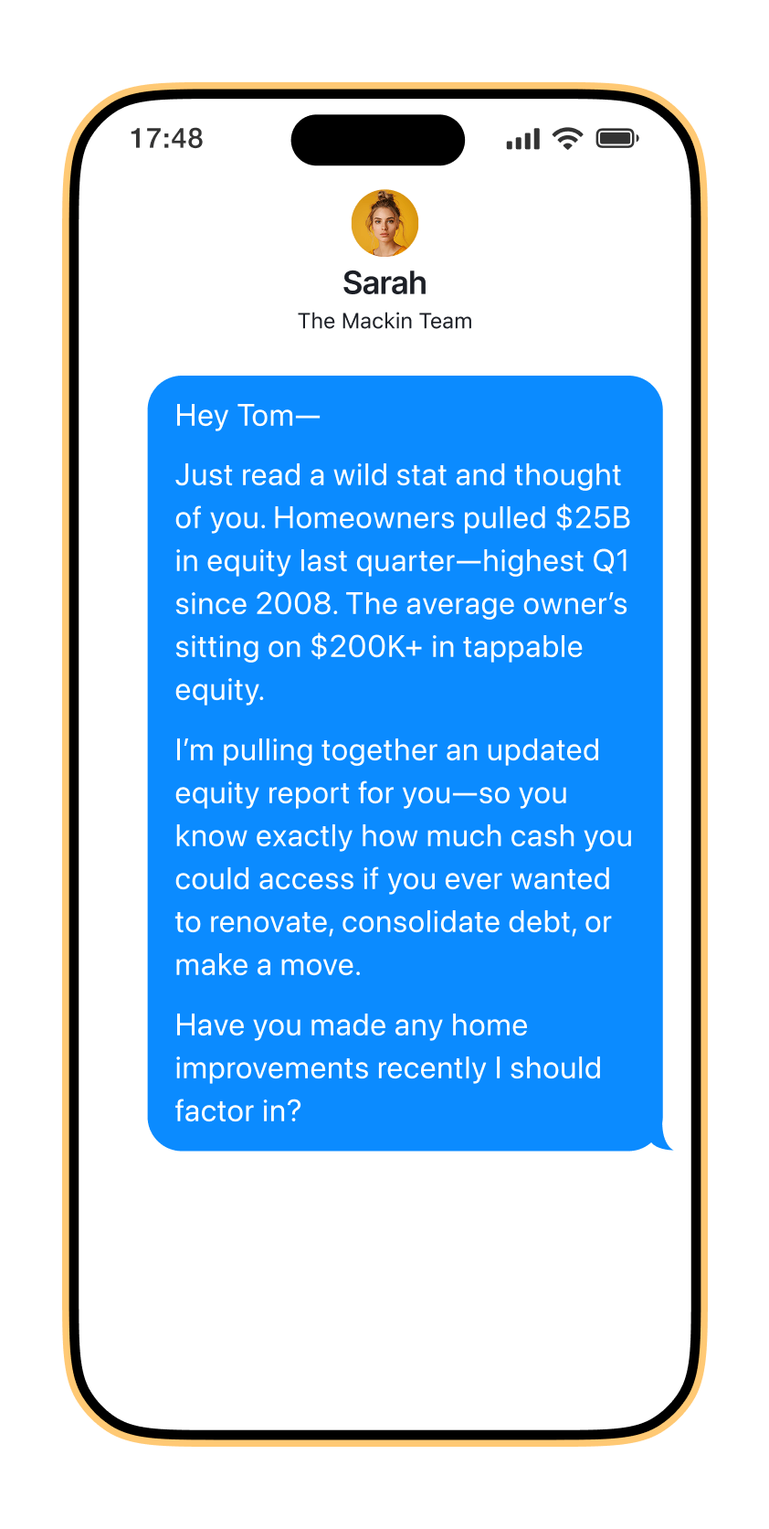 Reach out to 5–10 people in your sphere or past clients with a quick, personalized equity update.