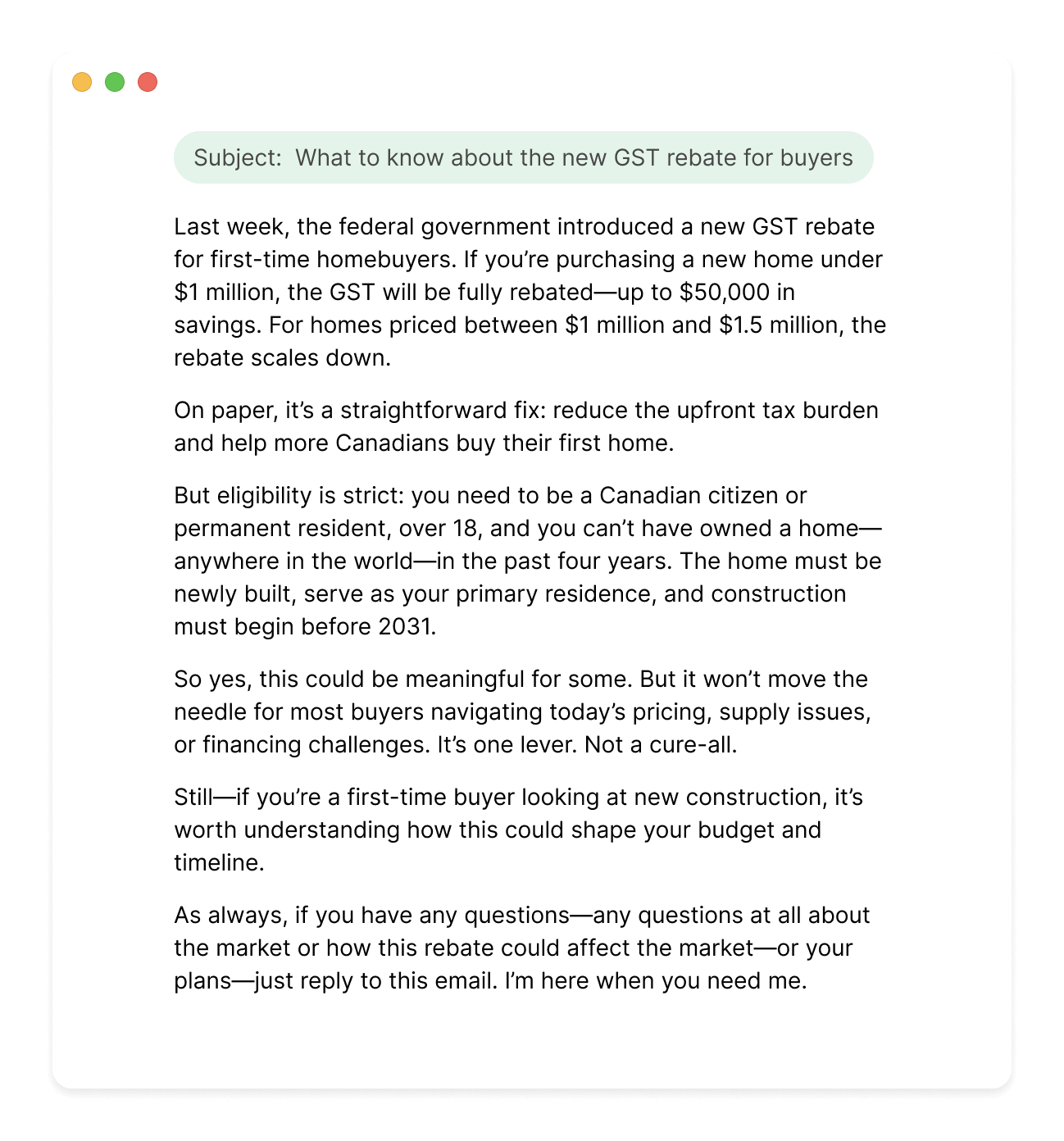 You need a platform that lets you send mass emails to your database. Use what you have—FUB, Follow Up Boss, Mailchimp, KVCore, Constant Contact, etc. If you’re not set up yet, get that handled first. You can’t send if you can’t hit send.