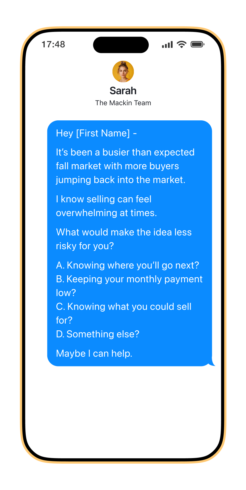 This follow-up is simple on purpose. Lead with a direct reason you’re reaching out (“busy fall, lots of questions coming in”), then ask a clear multiple-choice question that’s effortless to answer. Short taps, fast signal. You’ll learn what matters - next home, payment, price, or something else - and you’ll know who to call first.