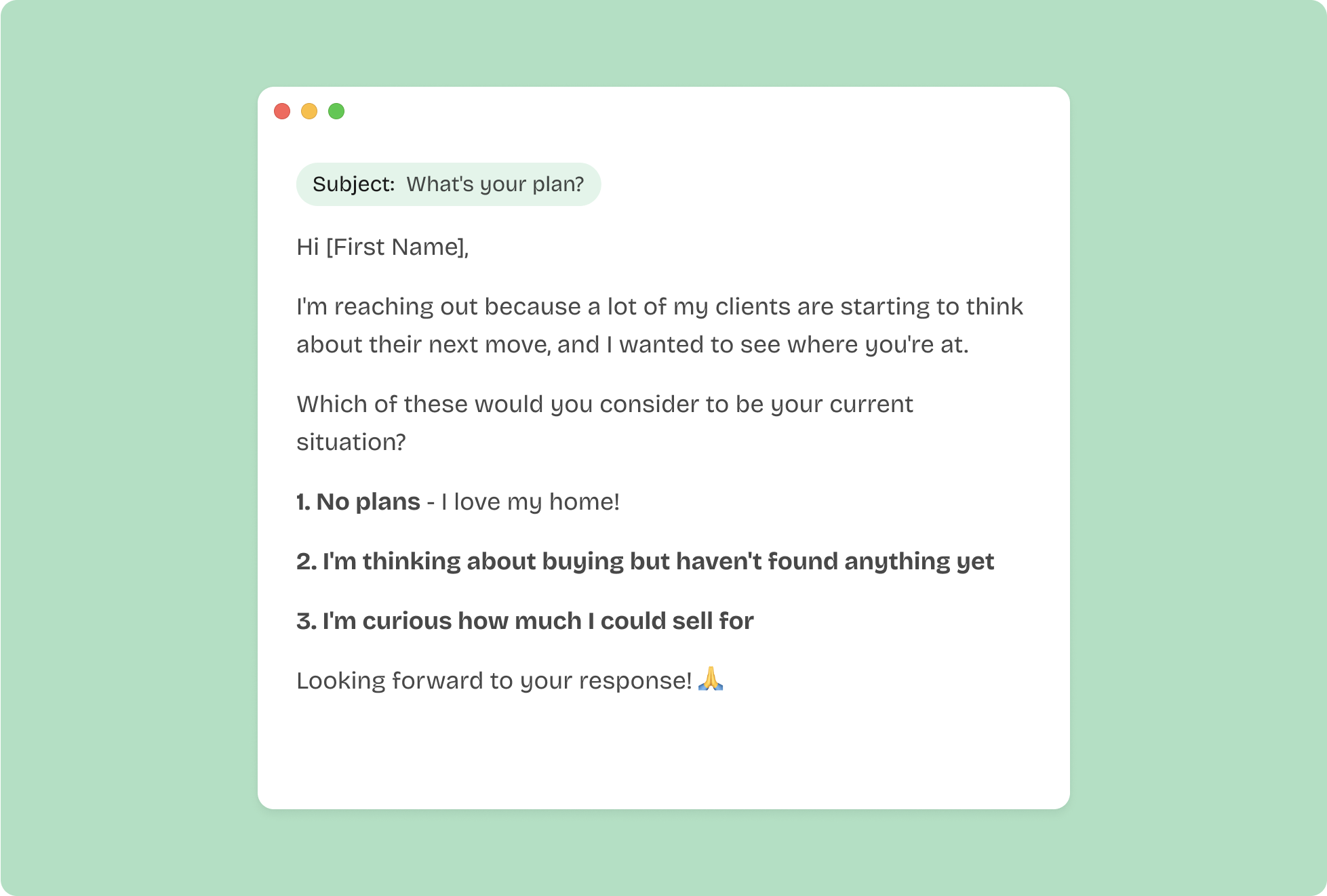 You need a platform that lets you send mass emails to your database. Use what you have—FUB, Follow Up Boss, Mailchimp, KVCore, Constant Contact, etc. If you’re not set up yet, get that handled first. You can’t send if you can’t hit send.