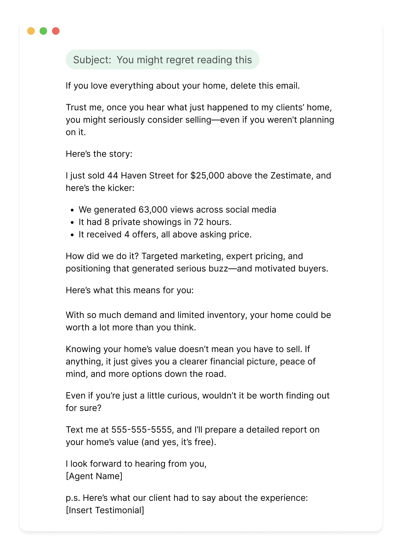 Pro-Tip: Add your client’s testimonial in the P.S. to build even more credibility and trust.