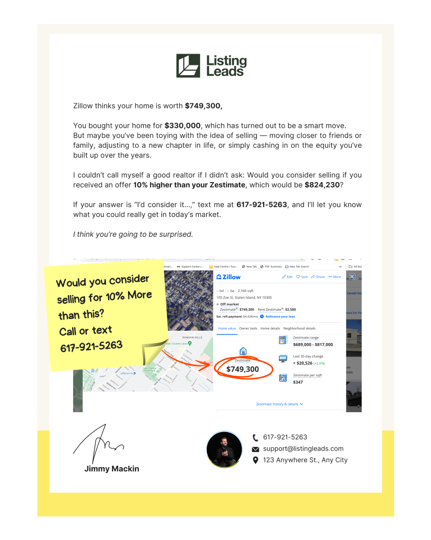 This is a campaign known as the ZMA letter. It’s a simple, but highly effective marketing campaign that helps you start a conversation with prospective sellers.Â
