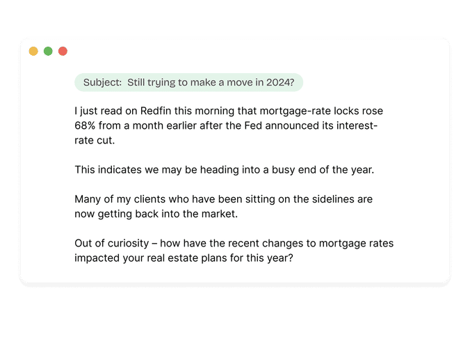 In today's dynamic real estate market, keeping your clients informed is crucial for maintaining strong relationships and positioning yourself as their go-to advisor. By regularly sharing timely and relevant market insights, you can ensure you stay top of mind with your clients. This proactive approach not only demonstrates your expertise but also helps you generate high-quality inbound leads, as clients will appreciate the value you provide and are more likely to reach out when they're ready to make real estate decisions.