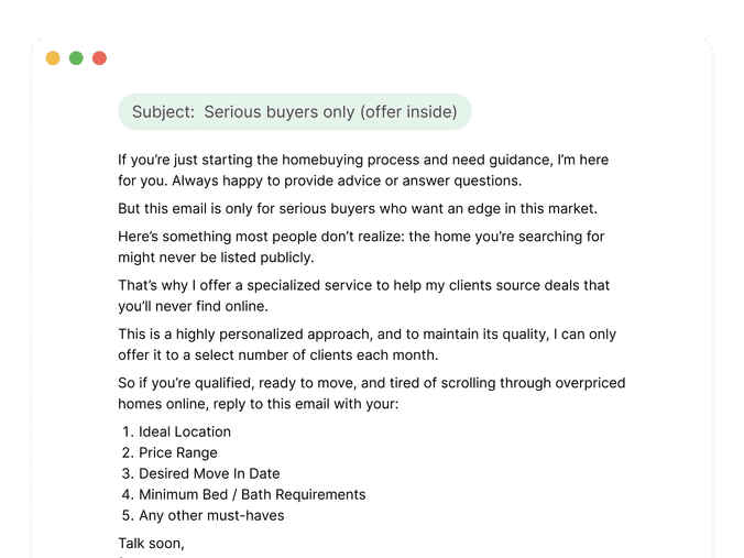Her secret? Specificity and a personal touch. Sellers connect with real people, not just data points. Share meaningful details (without getting too personal)—your buyers’ budget, preferred location, or even a note about why they’re drawn to that specific neighborhood. These small touches make your message authentic and memorable.