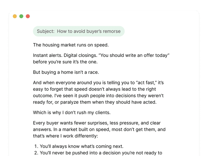 It leads with empathy. It sounds personal, even off-the-cuff. And it mirrors the exact conversations many agents are already having right now, where people want to move but feel frozen by uncertainty.