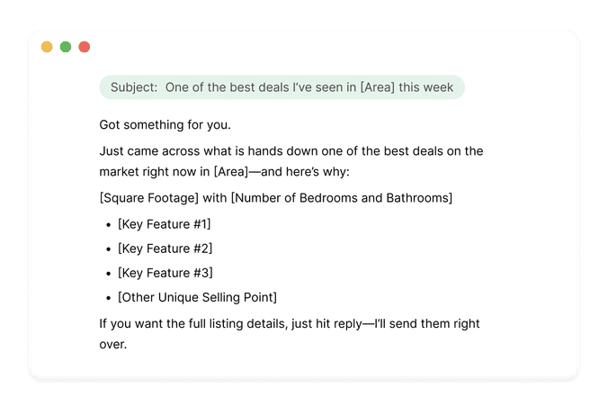 Use the template we provided below to send out your Deal of the Week, use this free tool to write the email and send it yourself, or get AIÂ Mode to automate the entire process for you.
