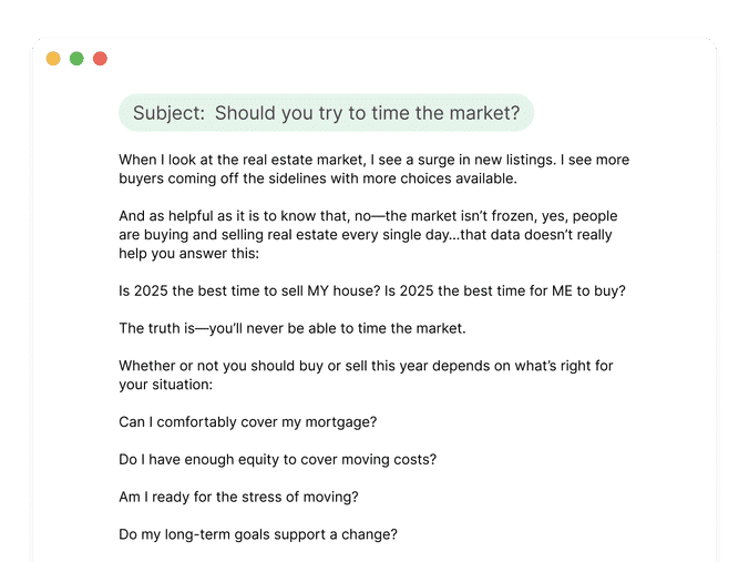 It leads with empathy. It sounds personal, even off-the-cuff. And it mirrors the exact conversations many agents are already having right now, where people want to move but feel frozen by uncertainty.