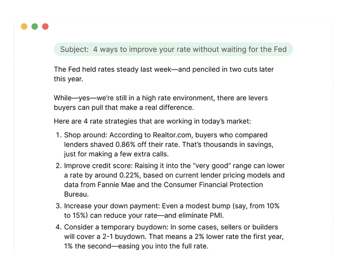 Use this email to educate, empower, and move buyers off the sidelines with four proven rate strategies that work right now.