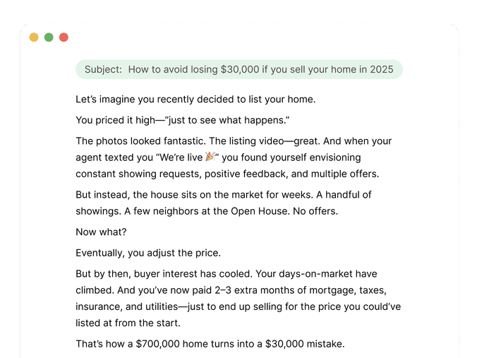 Not by scaring people. But by walking them through a familiar (and avoidable) scenario: a high list price… a few quiet weeks… and eventually, a sale that costs them an extra $23K in holding costs they never planned for.