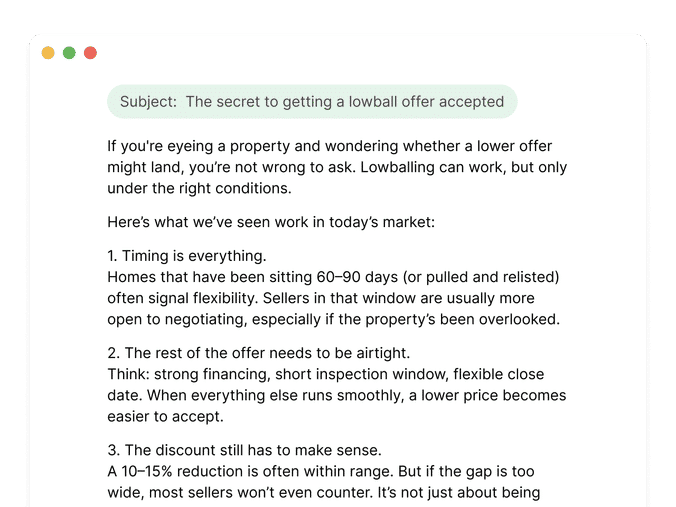 This email helps you name that disconnect and start the kind of conversation that leads to smarter pricing, stronger positioning, and fewer surprises. We also added a soft P.S. for buyers—because in this market, some well-priced homes are absolute steals.