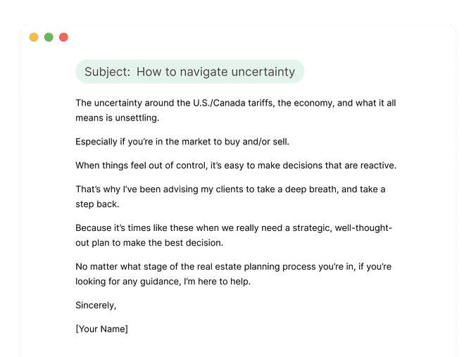 It leads with empathy. It sounds personal, even off-the-cuff. And it mirrors the exact conversations many agents are already having right now, where people want to move but feel frozen by uncertainty.